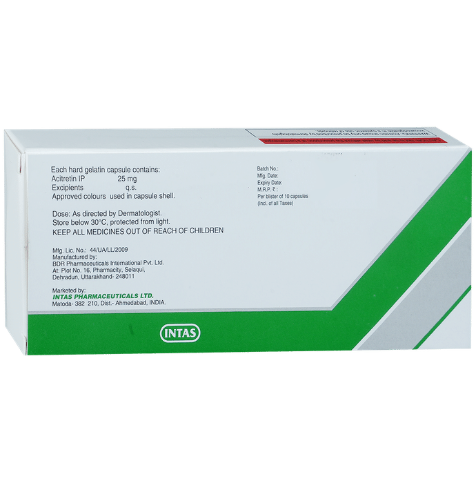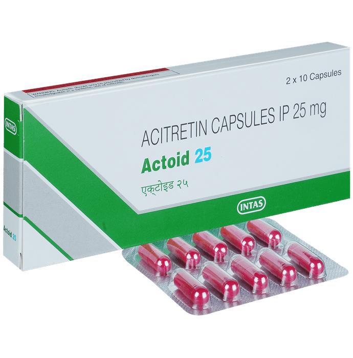 Is Actoid 25mg Capsule an immunosuppressant?::: No, Actoid 25mg Capsule is not an immunosuppressant. It belongs to the retinoid class of medicines. It is used to treat severe form of psoriasis.| Can I drink alcohol while taking Actoid 25mg Capsule?::: Do not consume anything that contains alcohol while taking Actoid 25mg Capsule and for 2 months after treatment. Actoid 25mg Capsule and alcohol combine to form a substance that may remain in the body for more than 3 years.| How long does Actoid 25mg Capsule take to work?::: Actoid 25mg Capsule does not work right away. It may take about 2-4 weeks to see an improvement and about 2-3 months before you see the full benefits of this medicine. Therefore, you should continue taking it even if you do not see any improvement initially.| What is the most important information that I should know about Actoid 25mg Capsule?::: Actoid 25mg Capsule can cause serious birth defects in your unborn child. Therefore, you should not take Actoid 25mg Capsule if you are pregnant or plan to become pregnant within the next 3 years. Actoid 25mg Capsule may also cause liver damage. Therefore, contact your doctor immediately if you experience nausea, vomiting, loss of appetite, pain in the upper right part of the stomach, yellowing of the skin or eyes, or dark urine.| Does Actoid 25mg Capsule affect sperm?::: No, Actoid 25mg Capsule does not affect the sperm. However, it has been seen that small amounts of this medicine may pass into the semen. But, this small amount does not pose a risk to an unborn child.| How should I take Actoid 25mg Capsule?::: It is generally recommended to take Actoid 25mg Capsule once daily with meals or milk. The dosage varies from person to person and is decided by your doctor. Swallow the medicine whole and do not crush or cut it.| Can I donate blood while on Actoid 25mg Capsule?::: No, you should not donate blood while on Actoid 25mg Capsule. Moreover, do not donate blood 3 years after stopping the treatment with Actoid 25mg Capsule. The medicine present in your blood can harm an unborn child if your blood is given to a pregnant mother. However, Actoid 25mg Capsule does not affect your ability to receive a blood transfusion.| What should I avoid while taking Actoid 25mg Capsule?::: Actoid 25mg Capsule may affect your night vision. Therefore, you should avoid driving at night. Avoid supplemental foods containing vitamin A while taking this medicine since it may add to the side effects. Also, avoid sunlight and sun lamps as Actoid 25mg Capsule can make your skin more sensitive to ultraviolet light.| Is Actoid 25mg Capsule an immunosuppressant?::: No, Actoid 25mg Capsule is not an immunosuppressant. It belongs to the retinoid class of medicines. It is used to treat severe form of psoriasis.| Can I drink alcohol while taking Actoid 25mg Capsule?::: Do not consume anything that contains alcohol while taking Actoid 25mg Capsule and for 2 months after treatment. Actoid 25mg Capsule and alcohol combine to form a substance that may remain in the body for more than 3 years.| How long does Actoid 25mg Capsule take to work?::: Actoid 25mg Capsule does not work right away. It may take about 2-4 weeks to see an improvement and about 2-3 months before you see the full benefits of this medicine. Therefore, you should continue taking it even if you do not see any improvement initially.| What is the most important information that I should know about Actoid 25mg Capsule?::: Actoid 25mg Capsule can cause serious birth defects in your unborn child. Therefore, you should not take Actoid 25mg Capsule if you are pregnant or plan to become pregnant within the next 3 years. Actoid 25mg Capsule may also cause liver damage. Therefore, contact your doctor immediately if you experience nausea, vomiting, loss of appetite, pain in the upper right part of the stomach, yellowing of the skin or eyes, or dark urine.| How should I take Actoid 25mg Capsule?::: It is generally recommended to take Actoid 25mg Capsule once daily with meals or milk. The dosage varies from person to person and is decided by your doctor. Swallow the medicine whole and do not crush or cut it.| Can I donate blood while on Actoid 25mg Capsule?::: No, you should not donate blood while on Actoid 25mg Capsule. Moreover, do not donate blood 3 years after stopping the treatment with Actoid 25mg Capsule. The medicine present in your blood can harm an unborn child if your blood is given to a pregnant mother. However, Actoid 25mg Capsule does not affect your ability to receive a blood transfusion.| What should I avoid while taking Actoid 25mg Capsule?::: Actoid 25mg Capsule may affect your night vision. Therefore, you should avoid driving at night. Avoid supplemental foods containing vitamin A while taking this medicine since it may add to the side effects. Also, avoid sunlight and sun lamps as Actoid 25mg Capsule can make your skin more sensitive to ultraviolet light.| Does Actoid 25mg Capsule affect sperm?::: No, Actoid 25mg Capsule does not affect the sperm. However, it has been seen that small amounts of this medicine may pass into the semen. But, this small amount does not pose a risk to an unborn child.: