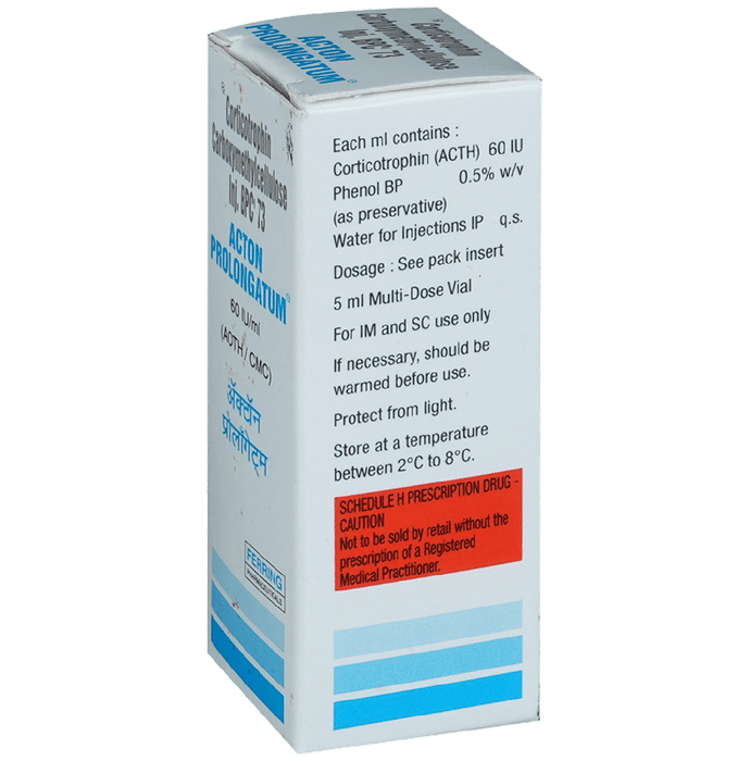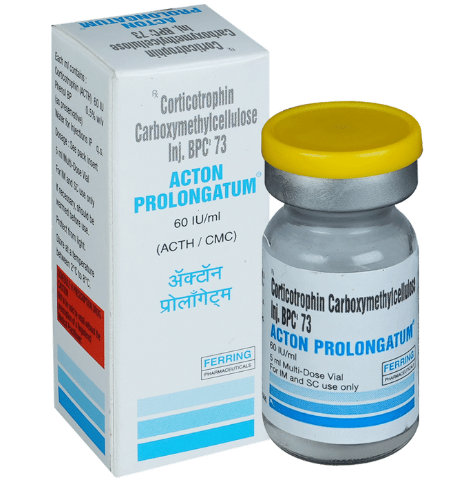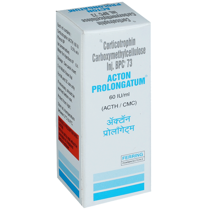 Acton Prolongatum 60IU Injection is an adrenocorticotropic hormone analogue. It is used in the treatment of infantile spasms. Acton Prolongatum 60IU Injection is given as an injection into the skin or muscles under the supervision of a doctor.  It should be taken as your doctor’s advice. The dose and how often you take it depends on what you are taking it for. Your doctor will decide how much you need to improve your symptoms. You should take this medicine for as long as it is prescribed for you.The most common side effects of this medicine include fluid retention, increased appetite, glucose intolerance, and high blood pressure.  If these bother you or appear serious, let your doctor know. There may be ways of reducing or preventing them.Before taking this medicine, tell your doctor if you have ever had high blood pressure, or heart problems or had liver or kidney disease. Your doctor should also know about all other medicines you are taking as many of these may make this medicine less effective or change the way it works. Tell your doctor if you are pregnant, planning pregnancy or breastfeeding.