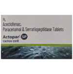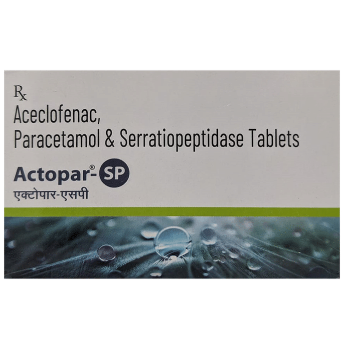 What is Actopar-SP Tablet?::: It is a combination of three medicines: Aceclofenac, Paracetamol, and Serratiopeptidase. This medication helps in relieving pain and inflammation. It works by lowering the levels of chemical substances in the body that cause pain and inflammation.| Is it safe to take Actopar-SP Tablet?::: It is safe to take this medicine for most of the patients. However, in some patients, it may cause unwanted side effects like nausea, vomiting, stomach pain, heartburn, and diarrhea. If you experience any persistent problem due to the medication, inform your doctor as soon as possible.| Can I stop taking Actopar-SP Tablet when my pain is relieved?::: This medicine is usually used for the short term and can be discontinued when your pain is relieved. However, continued taking it if your doctor has advised you to do so.| Can Actopar-SP Tablet cause nausea and vomiting?::: Yes, the use of this medicine can cause nausea and vomiting. In case you experience nausea while taking this medicine, take it with milk, food, or with antacids. Avoid taking fatty or fried foods along with this medication. In case of vomiting, drink plenty of water or other fluids by taking small frequent sips. Talk to your doctor if vomiting persists and you notice signs of dehydration, like dark colored and strong-smelling urine and a low frequency of urination. Do not take any other medicines without speaking to your doctor.| Can Actopar-SP Tablet cause dizziness?::: Yes, the use of this medicine can cause dizziness (feeling faint, weak, unsteady or lightheaded) in some patients. If you feel dizzy or lightheaded, it is better to rest for sometime and resume once you feel better.| Are there any specific contraindications associated with taking Actopar-SP Tablet?::: The use of this medicine is considered harmful for patients with known allergy to any of the components or excipients of this medicine or in patients with known allergy to other painkillers (NSAIDs). Its use should preferably be avoided in patients with a history of stomach ulcers or in patients with active, recurrent stomach ulcers/bleeding. It should also be avoided in patients with a history of heart failure, high blood pressure, and liver or kidney disease.| Can I take Actopar-SP Tablet with vitamin B-complex?::: Yes, this medicine can be taken with vitamin B-complex preparations. While it helps to relieve pain, vitamin B-complex can help to correct the vitamin deficiency that might be causing your symptoms.| Can the use of Actopar-SP Tablet cause damage to kidneys?::: Yes, long-term use of this medicine can cause damage to the kidneys. Normal kidneys produce a chemical called prostaglandins that protect them from damage. The use of painkillers lowers the levels of prostaglandins in the body, which leads to kidney damage on long-term use. The use of painkillers is not recommended in patients with underlying kidney disease.| Can I take a higher dose of Actopar-SP Tablet than recommended?::: No, taking a higher than recommended dose can lead to increased chances of side effects. If you are experiencing increased severity of pain or the pain is not relieved by the recommended doses, please consult your doctor for re-evaluation.| What are the instructions for storage and disposal of Actopar-SP Tablet?::: Keep this medicine in the packet or the container it came in, tightly closed. Store it according to the instructions mentioned on the pack or label. Dispose of the unused medicine. Make sure it is not consumed by pets, children and other people.: