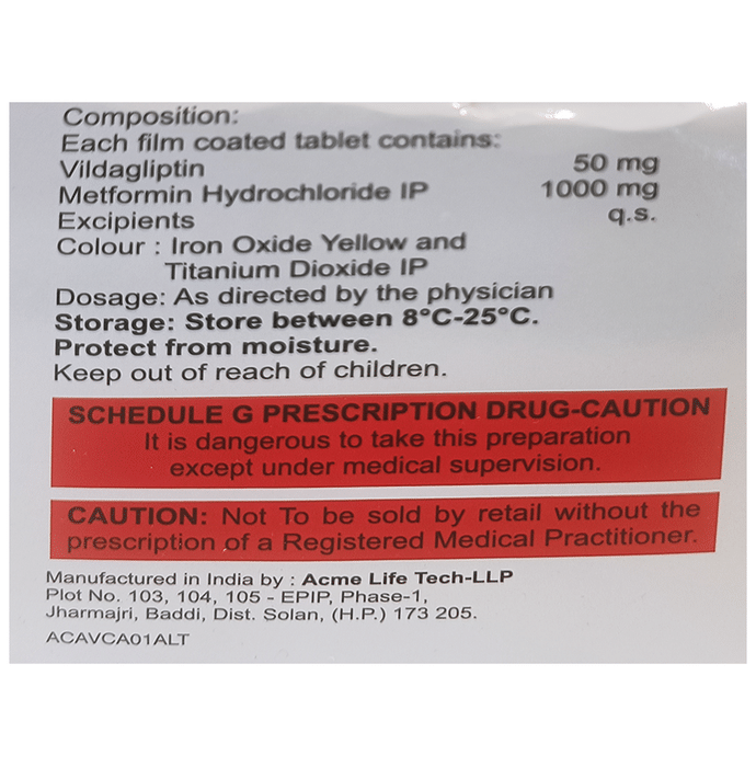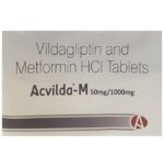 Can the use of Acvilda-M 1000mg/50mg Tablet lead to hypoglycemia?::: The use of Acvilda-M 1000mg/50mg Tablet does not usually cause hypoglycemia (low blood sugar level) alone. But it could occur if there is insufficient supplementation of calories while taking this medicine. Symptoms of hypoglycemia include nausea, headache, irritability, hunger, sweating, dizziness, fast heart rate, and feeling anxious or shaky. The symptoms are more likely to be noticed if you miss or delay your food, drink alcohol, over-exercise, or take any other antidiabetic medicine along with it. So, regular monitoring of blood sugar levels is important. It is recommended to always carry glucose tablets, honey, or fruit juice with you.| Can the use of Acvilda-M 1000mg/50mg Tablet cause nausea and vomiting?::: Yes, the use of Acvilda-M 1000mg/50mg Tablet can cause nausea and vomiting. In case of vomiting, drink plenty of water or other fluids by taking small frequent sips. Talk to your doctor if vomiting persists and you notice signs of dehydration, like dark-colored and strong-smelling urine and a low frequency of urination. Do not take any other medicine without speaking to a doctor.| Are there any specific contraindications associated with the use of Acvilda-M 1000mg/50mg Tablet?::: The use of Acvilda-M 1000mg/50mg Tablet should be avoided in patients with known allergies to any of the components or excipients of this medicine. The use of this medicine is also considered to be harmful to patients with severe kidney impairment, liver impairment, congestive heart failure, lactic acidosis, or diabetic ketoacidosis.| What is the storage condition for the Acvilda-M 1000mg/50mg Tablet?::: Keep this medicine in the container or the pack it came in, tightly closed. Store it according to the instructions mentioned on the pack or label. Dispose of the unused medicine. Make sure it is not consumed by pets, children, and other people.| What is Acvilda-M 1000mg/50mg Tablet?::: Acvilda-M 1000mg/50mg Tablet is a combination of two anti-diabetic drugs: Metformin and Vildagliptin. Metformin is an anti-diabetic medicine and belongs to the class of biguanides. It lowers the glucose production in the liver, delays glucose absorption from the intestines, and increases the body’s sensitivity to insulin. Vildagliptin inhibits the enzyme DPP4 inhibitor and increases the release of insulin from the pancreas. This combination is not advised for patients below 18 years of age.| Can the use of Acvilda-M 1000mg/50mg Tablet cause lactic acidosis?::: Yes, the use of Acvilda-M 1000mg/50mg Tablet can lead to lactic acidosis. It is a medical emergency that is caused by increased levels of lactic acid in the blood. It is also known as MALA (Metformin-associated lactic acidosis). It is a very rare side effect associated with the use of metformin and therefore, it is avoided in patients with underlying kidney disease, old age patients, or who take large amounts of alcohol. Symptoms of lactic acidosis may include muscle pain or weakness, dizziness, tiredness, feeling of cold in arms and legs, difficulty in breathing, nausea, vomiting, stomach pain, or slow heart rate. If you have these symptoms, stop taking Acvilda-M 1000mg/50mg Tablet and immediately consult your doctor.| Can the use of Acvilda-M 1000mg/50mg Tablet lead to Vitamin B12 deficiency?::: Yes, the use of Acvilda-M 1000mg/50mg Tablet can cause Vitamin B12 deficiency with long-term use. It interferes with the absorption of Vitamin B12 in the stomach. If untreated, it may cause anemia and nerve problems.| Is it safe to use Acvilda-M 1000mg/50mg Tablet?::: Yes, it is safe to use Acvilda-M 1000mg/50mg Tablet if you take it for the prescribed duration and according to the dosage advised by the doctor. However, despite taking the prescribed dosage you might experience common side effects like nausea, diarrhea, vomiting, stomach upset, headache, nasal congestion, sore throat, respiratory tract infection, hypoglycemia (low blood sugar level) in combination with insulin or sulphonylurea. Inform your doctor if you experience any persistent problem while taking this medicine.: