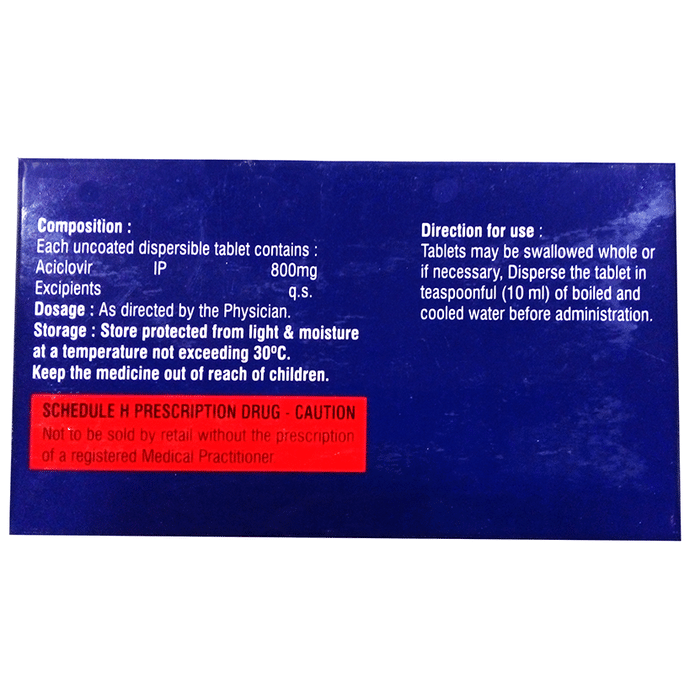 Acylin 800 Tablet DT is an antiviral medicine. It helps in treating viral infections like herpes labialis, herpes simplex, shingles, genital herpes infection, and chickenpox. It prevents the multiplication of virus in human cells and therefore helps in clearing the infection. Acylin 800 Tablet DT should be taken in the dose and duration as advised by your doctor. Do not skip any doses and finish the full course of treatment even if you feel better. Dissolve it in a glass of water before taking it. It may be taken with or without food, but it is better to take it at a fixed time. If you miss a dose, take it as soon as possible. However, if it is almost time for your next dose, skip the missed dose and go back to your regular schedule. Do not double the dose. You should drink plenty of water while on treatment with this medicine as it helps to prevent dehydration and kidney damage.Some side effects of this medicine include headache, dizziness, vomiting, nausea, fatigue, and fever. Inform your doctor if these side effects do not resolve or persist for a longer duration. Please consult your doctor if you are pregnant, planning to conceive or breastfeeding.