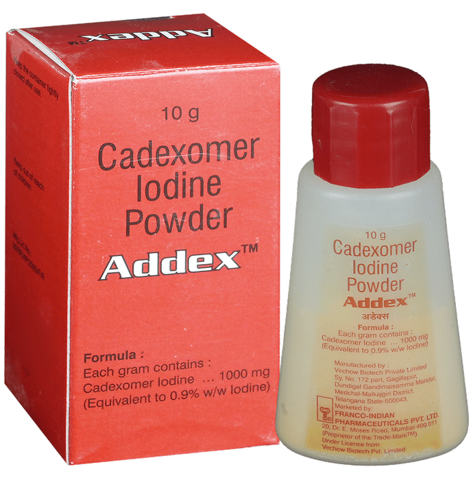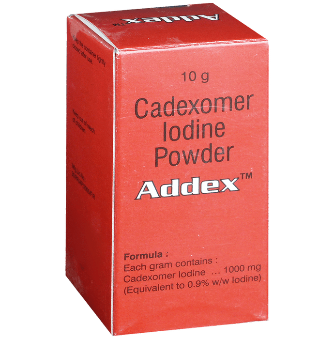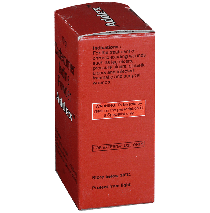 What is Addex Powder and what is it used for?::: Addex Powder is a dual-action wound management product that is used for the treatment of leg and diabetic ulcers. It has antimicrobial properties that prevent infection at the site and promotes healing.| Are there any serious side-effects of using Addex Powder?::: Patients treated with Addex Powder may experience slight pain within the first hour after application. Minor reddening or swelling around the wound may occur without necessarily being an allergic reaction. Although this is temporary, contact your doctor immediately if it does not subside.| How long should I use Addex Powder?::: Ideally, this medicine should not be used for longer than 3 months without checking with your doctor. This varies from patient to patient and their condition.| What happens if I miss a dose of Addex Powder?::: Apply the missed dose as soon as you remember. Skip the missed dose if it is almost time for your next scheduled dose. Do not apply extra medicine to make up for the missed dose. Discuss this with your healthcare provider. In order to avoid missing a dose, use a calendar, pillbox, alarm clock, or cell phone alert to help you remember to use your medication. You may also ask a family member a friend to remind you or check in with you to be sure you are using your medication.| Can Addex Powder be used in children?::: No, this medicine should not be used in children under 12 years of age.| How to safely store Addex Powder?::: As with most medications, Addex Powder should be stored at room temperature. Store it in a secure location where it will not be exposed to excessive heat, moisture, or direct sunlight. Keep it out of reach of children. Make sure that any leftover portion is disposed of safely.: