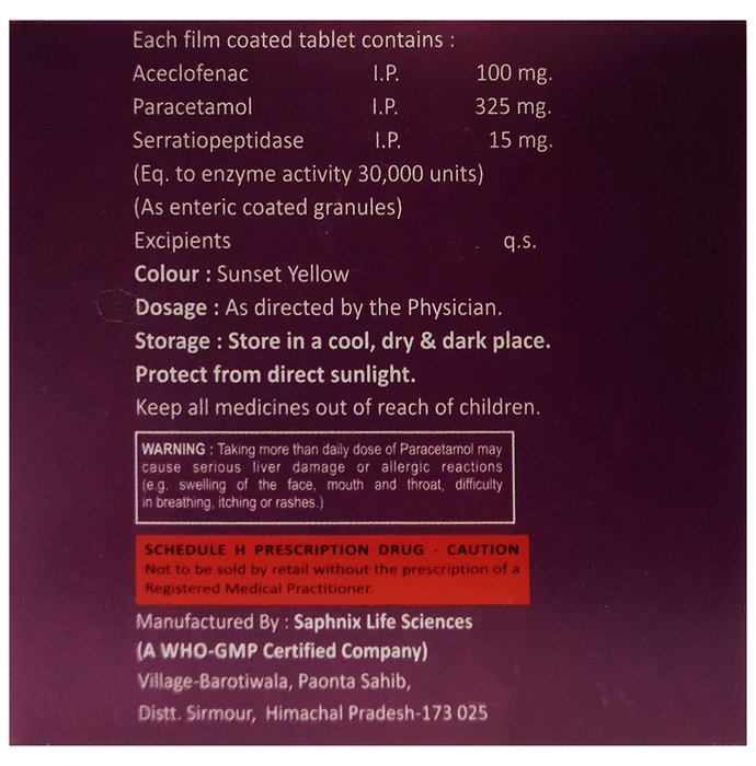 Aceclofenac (100mg) + Paracetamol (325mg) + Serratiopeptidase (15mg):<packagingdetail>:Strip: