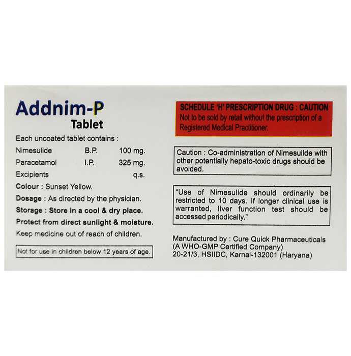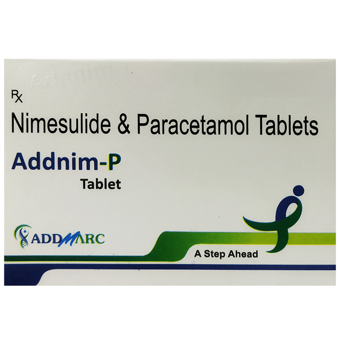What is Addnim-P Tablet?::: Addnim-P Tablet is a combination of two medicines: Nimesulide and Paracetamol. This medication helps in relieving the pain and inflammation. It works by lowering the levels of chemical substances in the body that cause pain and inflammation.| Can I stop taking Addnim-P Tablet when my pain is relieved?::: Addnim-P Tablet is usually used for short-term pain relief and can be discontinued if there is no pain. However, it should be continued if your physician has advised you to do so.| Can the use of Addnim-P Tablet cause nausea and vomiting?::: Yes, the use of Addnim-P Tablet can cause nausea and vomiting. Taking it with milk, food or with antacids can prevent nausea. Avoid taking fatty or fried foods along with this medicine. In case of vomiting, drink plenty of water or other fluids by taking small and frequent sips. Talk to your doctor if vomiting persists and you notice any signs of dehydration, like dark colored and strong-smelling urine and a low frequency of urination. Do not take any other medicine without speaking to your doctor.| Are there any specific contraindications associated with the use of Addnim-P Tablet?::: The use of Addnim-P Tablet is considered to be harmful in patients with known allergy to any of the components or excipients of this medicine or in patients with known allergy to other painkillers (NSAIDs). Its use should also be avoided in patients with a history of stomach ulcers or in patients with active, recurrent stomach ulcer/bleeding. It should also be avoided in patients with the history of heart failure, high blood pressure, and liver or kidney disease.| Can I take Addnim-P Tablet with Vitamin B-complex?::: Yes, Addnim-P Tablet can be taken with Vitamin B-complex preparations. While Addnim-P Tablet helps to relieve pain, Vitamin B-complex helps to correct the vitamin deficiency that might be causing your symptoms.| Does Addnim-P Tablet help in relieving stomach pain?::: No, Addnim-P Tablet preferably should not be taken for stomach pain without consulting a physician. This drug can increase stomach acid secretion which may aggravate an unknown underlying condition.| Can the use of Addnim-P Tablet cause damage to the liver?::: Addnim-P Tablet contains Nimesulide and Paracetamol and both these medicines are known to cause harm to the liver especially in the doses above the recommended level. Also, avoid drinking alcohol while taking this medicine, as it may further increase your risk of liver damage. Use of this medicine should preferably be avoided in patients with the underlying liver disease.| Is it safe to take a higher than the recommended dose of Addnim-P Tablet?::: No, you should avoid taking a higher than the recommended dose of Addnim-P Tablet as it can increase the risks of side effects. If you are experiencing increased severity of pain or the pain is not relieved by the recommended doses, please consult your doctor for re-evaluation.| What are the recommended storage conditions for Addnim-P Tablet?::: Keep this medicine in the container or the pack it came in, tightly closed. Store it as mentioned on the pack or label. Dispose of the unused medicine. Make sure it is not consumed by pets, children and other people.: