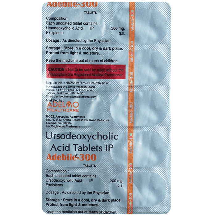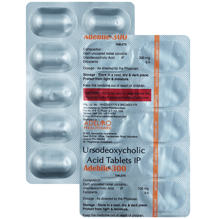 When should I take Adebile 300 Tablet?::: The suitable timing of taking this medicine might differ depending upon your condition. Your doctor might instruct you to take 2 to 3 doses per day and suggest to take the last dose at bedtime. Adebile 300 Tablet should be taken with water milk and can be taken with food or after food. When prescribed for dissolving gallstones, it is usually suggested to be taken once daily at night. Ideally, it should be taken at a gap of 6 hours, for example at 8 am, 2 pm and 8 pm. | Is Adebile 300 Tablet safe?::: Adebile 300 Tablet is usually considered to be a safe and effective medicine. However, this medicine may have some common side effects, such as diarrhea. If diarrhea occurs, your doctor may reduce the dose and if it persists, your treatment may be discontinued. Additionally, using this medicine as a long-term therapy may also affect your liver enzyme levels. To keep a check on this, your doctor will keep monitoring your liver enzyme levels regularly. Despite these minor side effects, this medicine is supposed to be a good alternative to surgery in some patients with gallstones.| How does Adebile 300 Tablet help the liver?::: Adebile 300 Tablet acts on the liver and gets concentrated in the bile secreted from the liver. This, as a result, suppresses the synthesis and secretion of cholesterol by the liver, thereby decreasing the cholesterol levels in bile. This medicine also acts by stopping the intestines from absorbing the bile salts and cholesterol. So, the reduced cholesterol saturation in the bile from the liver leads to the gradual dissolving of cholesterol from gallstones, leading to a decrease in size and their eventual dissolution. It also reduces elevated liver enzyme levels by increasing the bile flow through the liver, hence protecting the liver cells.| Does Adebile 300 Tablet cause weight gain?::: Yes, there is a chance of weight gain with Adebile 300 Tablet, but it is not common. The use of Adebile 300 Tablet can cause weight gain when prescribed in patients with liver disease associated with chronic stasis of bile in small bile ducts of the liver. In such condition, bile cannot flow from the liver to the small intestine. Again, the chance of weight gain varies from person to person depending upon the disease, so consult your doctor if you experience weight gain.| What should I avoid while taking Adebile 300 Tablet?::: While taking Adebile 300 Tablet, avoid taking an antacid preparation without consulting your doctor, as they decrease the effectiveness of Adebile 300 Tablet. You should also avoid medicines like cholestyramine or colestipol as they affect the effectiveness of Adebile 300 Tablet. So, ask your doctor about the time gap that should be maintained between Adebile 300 Tablet and these medicines. Also, avoid taking oral contraceptives, estrogenic hormones and blood cholesterol-lowering agents such as clofibrate as they may increase the chances of developing gallstones and act opposite to the Adebile 300 Tablet.: