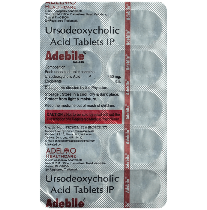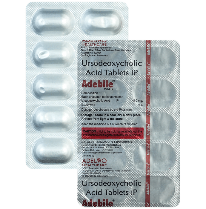 When should I take Adebile 450mg Tablet?::: The suitable timing of taking this medicine might differ depending upon your condition. Your doctor might instruct you to take 2 to 3 doses per day and suggest to take the last dose at bedtime. Adebile 450mg Tablet should be taken with water milk and can be taken with food or after food. When prescribed for dissolving gallstones, it is usually suggested to be taken once daily at night. Ideally, it should be taken at a gap of 6 hours, for example at 8 am, 2 pm and 8 pm. | Is Adebile 450mg Tablet safe?::: Adebile 450mg Tablet is usually considered to be a safe and effective medicine. However, this medicine may have some common side effects, such as diarrhea. If diarrhea occurs, your doctor may reduce the dose and if it persists, your treatment may be discontinued. Additionally, using this medicine as a long-term therapy may also affect your liver enzyme levels. To keep a check on this, your doctor will keep monitoring your liver enzyme levels regularly. Despite these minor side effects, this medicine is supposed to be a good alternative to surgery in some patients with gallstones.| How does Adebile 450mg Tablet help the liver?::: Adebile 450mg Tablet acts on the liver and gets concentrated in the bile secreted from the liver. This, as a result, suppresses the synthesis and secretion of cholesterol by the liver, thereby decreasing the cholesterol levels in bile. This medicine also acts by stopping the intestines from absorbing the bile salts and cholesterol. So, the reduced cholesterol saturation in the bile from the liver leads to the gradual dissolving of cholesterol from gallstones, leading to a decrease in size and their eventual dissolution. It also reduces elevated liver enzyme levels by increasing the bile flow through the liver, hence protecting the liver cells.| Does Adebile 450mg Tablet cause weight gain?::: Yes, there is a chance of weight gain with Adebile 450mg Tablet, but it is not common. The use of Adebile 450mg Tablet can cause weight gain when prescribed in patients with liver disease associated with chronic stasis of bile in small bile ducts of the liver. In such condition, bile cannot flow from the liver to the small intestine. Again, the chance of weight gain varies from person to person depending upon the disease, so consult your doctor if you experience weight gain.| What should I avoid while taking Adebile 450mg Tablet?::: While taking Adebile 450mg Tablet, avoid taking an antacid preparation without consulting your doctor, as they decrease the effectiveness of Adebile 450mg Tablet. You should also avoid medicines like cholestyramine or colestipol as they affect the effectiveness of Adebile 450mg Tablet. So, ask your doctor about the time gap that should be maintained between Adebile 450mg Tablet and these medicines. Also, avoid taking oral contraceptives, estrogenic hormones and blood cholesterol-lowering agents such as clofibrate as they may increase the chances of developing gallstones and act opposite to the Adebile 450mg Tablet.:
