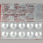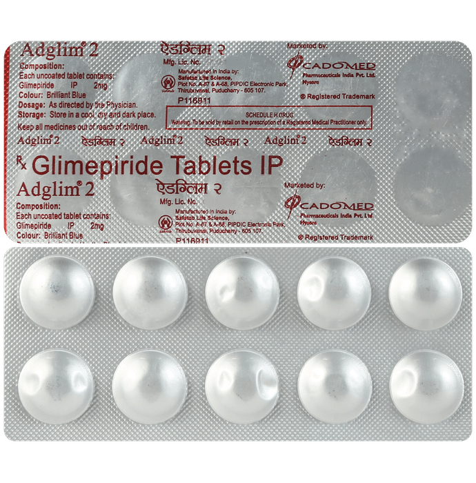 What is the dosage of Adglim 2mg Tablet?::: The recommended starting dose of Adglim 2mg Tablet is 1 mg or 2 mg once daily, administered with breakfast. If you are at a higher risk of low blood sugar (e.g., the elderly or patients with renal impairment), you will be given a starting dose of 1 mg once daily. The usual maintenance dose is 1–4 mg once daily. The maximum recommended dose is 8 mg once daily. After reaching a daily dose of 2 mg, the dosage will be increased not more than 2 mg at 1- to 2-week intervals, based on your blood glucose level. | Does Adglim 2mg Tablet make you sleepy?::: Adglim 2mg Tablet itself does not cause sleepiness. However, it may cause hypoglycemia (low blood sugar) when used with other anti-diabetes medicine. Because of this you may feel sleepy or have problems in sleeping.| Is Adglim 2mg Tablet safe for kidneys?::: Adglim 2mg Tablet does not affect kidneys in patients with normal kidney function. However, its use should be avoided in patients with severe kidney disease since Adglim 2mg Tablet is principally eliminated by the kidneys.| Does Adglim 2mg Tablet cause memory loss?::: No, it is not known that Adglim 2mg Tablet causes memory loss. However, the use of Adglim 2mg Tablet may cause low blood sugar which may cause problems with concentration and reduced alertness.| Who should not take Adglim 2mg Tablet?::: Adglim 2mg Tablet should be avoided by patients who are allergic to it, have severe kidney or liver disease, have G6PD-deficiency (an inherited condition affecting red blood cells) or are due to have surgery. Additionally, patients who are trying to get pregnant, are pregnant or breastfeeding, or have insulin-dependent diabetes (type 1 diabetes mellitus) should avoid taking Adglim 2mg Tablet.| How long does it take for Adglim 2mg Tablet to start working?::: Adglim 2mg Tablet takes about 2 to 3 hours to reduce blood sugar levels. You may not feel any difference, but this does not mean the medicine is not working. Continue taking the medication as directed by your doctor and if you have any concerns, discuss it with your doctor.| How long do I need to take Adglim 2mg Tablet? Can I stop the medication?::: Usually, the treatment for diabetes is suggested for a long term. You may have to continue the treatment life long. Adglim 2mg Tablet only controls the sugar levels but does not cure it. Do not stop taking Adglim 2mg Tablet without talking to your doctor. If you stop taking Adglim 2mg Tablet suddenly your diabetes may get worse.| What can happen if I take more than the recommended dose of Adglim 2mg Tablet?::: Adglim 2mg Tablet should be taken strictly as advised by the doctor. Overdose of Adglim 2mg Tablet may significantly decrease your blood sugar levels (hypoglycemia). If you think you have taken an excess dose and experience a dip in your sugar level, consume enough sugar (e.g., a small bar of sugar cubes, sweet juice or sweetened tea) and inform a doctor immediately. Severe cases of hypoglycemia accompanied by loss of consciousness and coma require immediate medical treatment and admission into hospital.| Can you take Adglim 2mg Tablet on an empty stomach?::: No. Taking Adglim 2mg Tablet on an empty stomach can cause your blood sugar levels to become too low. Low blood sugar can cause dizziness, shaking, anxiety, irritability, a fast heartbeat, and confusion. Therefore, you should always take the medicine with breakfast or the first meal of the day. If you are skipping your meal, then you should also avoid taking Adglim 2mg Tablet.| Can Adglim 2mg Tablet cause weight gain?::: Yes, Adglim 2mg Tablet can cause weight gain. Adglim 2mg Tablet is a sulfonylurea drug and causes the pancreas to release insulin. It may stimulate hunger and cause mild weight gain in some people. Patients are advised to eat a healthy balanced diet and exercise regularly to keep their weight stable. | Can Adglim 2mg Tablet cause dizziness? ::: Yes, Adglim 2mg Tablet can cause dizziness as a side effect. If this happens to you, sit or lie down until the symptoms pass. Always carry some sugary food or fruit juice with you in case you experience dizziness while travelling.| What should you not eat while taking Adglim 2mg Tablet?::: It is advisable to avoid foods that are high in saturated and trans fats, instead consume fats from fish and nuts. Control your carbohydrate intake as this directly affects your blood sugar.| Is Adglim 2mg Tablet safe to use?::: Yes, Adglim 2mg Tablet tablet is safe when used as directed by the doctor. However, it may show some side effects. For best results, it should be used in the correct dose and at the same time each day.| Can people with diabetes have proteins?::: Yes, people with diabetes must include proteins along with other essential nutrients in their daily diet. Proteins are one of the major energy providers among all essential nutrients. Besides, being the building blocks of the human body, proteins break down into glucose to release energy. Unlike carbohydrates, the metabolism of proteins into glucose is much slower. Therefore, the release of energy usually takes a few hours after consumption. Thus, the spike in blood sugar levels might occur after a few hours when you are on a high-protein diet.| Are artificial sweeteners good for people with diabetes?::: No, artificial sweeteners are not good for people with diabetes. They are composed of chemicals that can cause mild to severe side effects. Thus, it is better to limit or avoid their use as much as you can.| Can diabetes cause kidney failure?::: Yes, uncontrolled diabetes can cause kidney failure. In the long run, diabetes can affect the kidneys leading to a condition called diabetic nephropathy. Diabetic nephropathy is a condition that is a major cause of kidney failure in patients with diabetes. The best way to prevent damage to kidneys is by keeping diabetes in check, making dietary changes, monitoring sugar levels regularly, getting routine blood tests done, and taking prescribe