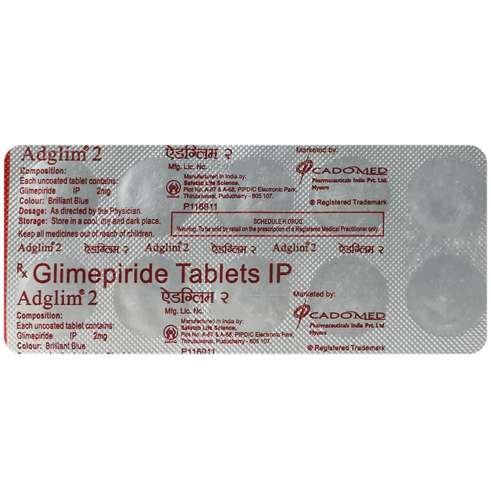Adglim 2mg Tablet belongs to a group of medicines called sulfonylureas and is used to treat type 2 diabetes mellitus in adults. It helps control blood sugar levels in people with diabetes thereby preventing serious complications of diabetes such as kidney damage and blindness. Adglim 2mg Tablet may be used alone or along with other medicines. It should be taken just before or with the first meal of the day. Take it regularly at the same time each day to get the maximum benefit. Your doctor will decide what dose is best for you and this may change from time to time according to your blood sugar levels.Keep taking Adglim 2mg Tablet, even if you feel well or your blood sugar levels are controlled. If you stop it without consulting your doctor, your blood sugar levels could rise to put you at risk of diabetes complications such as kidney damage, blindness, nerve problems, and loss of limbs. Remember that it is only part of a treatment program that should also include a healthy diet, regular exercise, and weight reduction as advised by your doctor. Your lifestyle plays a big part in controlling diabetes.The most common side effects of taking Adglim 2mg Tablet include low blood sugar levels (hypoglycemia), nausea, headache, weakness, and dizziness. Make sure you recognize the signs of having low blood sugar levels, such as sweating, dizziness, headache, and shaking, and know how to deal with them. To prevent this, it is important to have regular meals and always carry a fast-acting source of glucose such as sugary food or fruit juice with you. Drinking alcohol can also increase your risk of low blood sugar levels and hence should be avoided. Some people may experience an increase in weight with this medicine.You should not take Adglim 2mg Tablet if you have type 1 diabetes mellitus, diabetic ketoacidosis (high levels of acid in your blood), or if you have severe kidney or liver disease. Before taking this medicine, tell your doctor if you have ever had heart disease, thyroid disease, or some hormonal conditions, as it may not be suitable. Pregnant or breastfeeding women should also consult their doctor before taking it. Your blood sugar levels should be checked regularly and your doctor may also advise blood tests to monitor your blood cell counts and liver function.