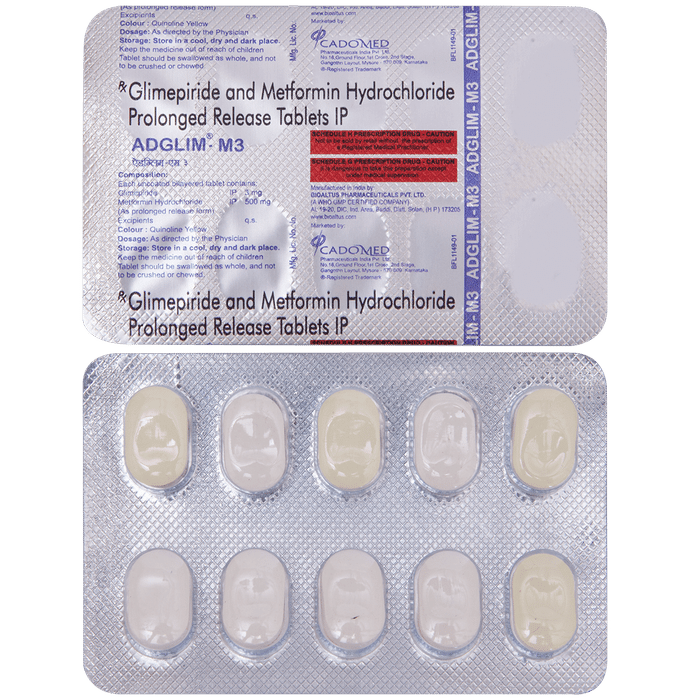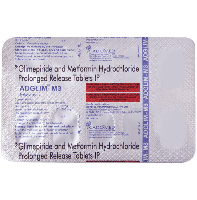 Adglim M 3mg/500mg Tablet PR belongs to a category of medicines known as anti-diabetic drugs. It is a combination of two medicines used to treat type 2 diabetes mellitus in adults. It helps control blood sugar levels in people with diabetes. Adglim M 3mg/500mg Tablet PR should be taken with food. Take it regularly at the same time each day to get the most benefit. Your doctor will decide what dose is best for you and this may change from time to time according to how it is working according to your blood sugar levels.Keep taking this medicine, even if you feel well or your blood sugar levels are controlled. If you stop it without consulting your doctor, your blood sugar levels could rise and put you at risk of kidney damage, blindness, nerve problems, and loss of limbs. Remember that it is only part of a treatment program that should also include a healthy diet, regular exercise, and weight reduction as advised by your doctor. Your lifestyle plays a big part in controlling diabetes.The most common side effect of Adglim M 3mg/500mg Tablet PR is low blood glucose levels (hypoglycemia). Make sure you recognize the signs of having low blood glucose levels, such as sweating, dizziness, headache, and shaking, and know how to deal with it. To prevent this, it’s important to have regular meals and always carry a fast-acting source of glucose such as sugary food or fruit juice with you. Drinking alcohol can also increase your risk of low blood sugar levels and should be avoided. Other side effects that may be seen on taking this medicine include taste changes, nausea, diarrhea, stomach pain, headache, and upper respiratory tract infection. Some people may find that they put on weight with this medicine.You should not take it if you have type 1 diabetes mellitus, if you have diabetic ketoacidosis (high levels of acid in your blood), or if you have severe kidney or liver disease. Before taking this medicine, tell your doctor if you have ever had heart disease. It may not be suitable. Pregnant or breastfeeding women should also consult their doctor before taking it. Your blood sugar levels should be checked regularly and your doctor may also advise blood tests to monitor your blood cell counts and liver function.