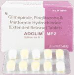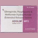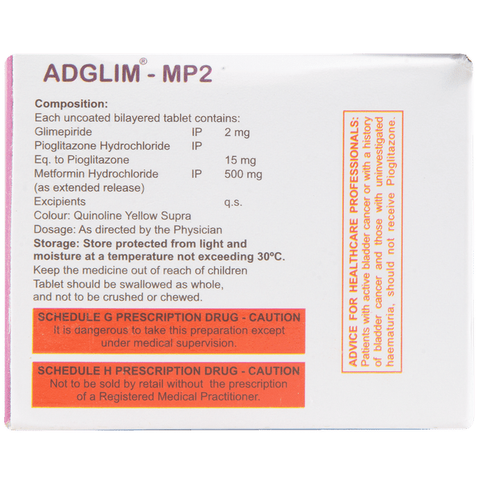 Can I drink alcohol while taking Adglim MP 2mg/500mg/15mg Tablet?::: No, it is not safe to drink alcohol while using Adglim MP 2mg/500mg/15mg Tablet. Drinking alcohol may lower your blood sugar levels (hypoglycemia). Also, it can increase the chances of lactic acidosis.| What should I inform the doctor before taking Adglim MP 2mg/500mg/15mg Tablet?::: Before taking Adglim MP 2mg/500mg/15mg Tablet inform your doctor if you have congestive heart failure, kidney problems, liver problems, swelling of the back of the eye. Inform the doctor if you are pregnant, breastfeeding or a premenopausal woman. Let the doctor know if you are taking any prescription and non-prescription medicines, vitamins, and herbal supplements.| Can the use of Adglim MP 2mg/500mg/15mg Tablet lead to Vitamin B12 deficiency?::: Yes, the use of Adglim MP 2mg/500mg/15mg Tablet can cause vitamin B12 deficiency as it contains metformin in it. On long-term use, it interferes with absorption of vitamin B12 in the stomach.| Can the use of Adglim MP 2mg/500mg/15mg Tablet cause hypoglycemia?::: Yes, the use of Adglim MP 2mg/500mg/15mg Tablet can cause hypoglycemia (low blood sugar level). Symptoms of hypoglycemia include nausea, headache, irritability, hunger, sweating, dizziness, fast heart rate and feeling anxious or shaky. It happens more often if you miss or delay your meal, drink alcohol, over-exercise or take other antidiabetic medicine along with it. So, regular monitoring of blood sugar level is important. Always carry some sugary item like a candy or chocolate with you.| What are the instructions for the storage and disposal of Adglim MP 2mg/500mg/15mg Tablet?::: Keep this medicine in the container it came in, tightly closed. Store it according to the instructions mentioned on the pack or label. Dispose of the unused medicine. Make sure it is not consumed by pets, children and other people.:
