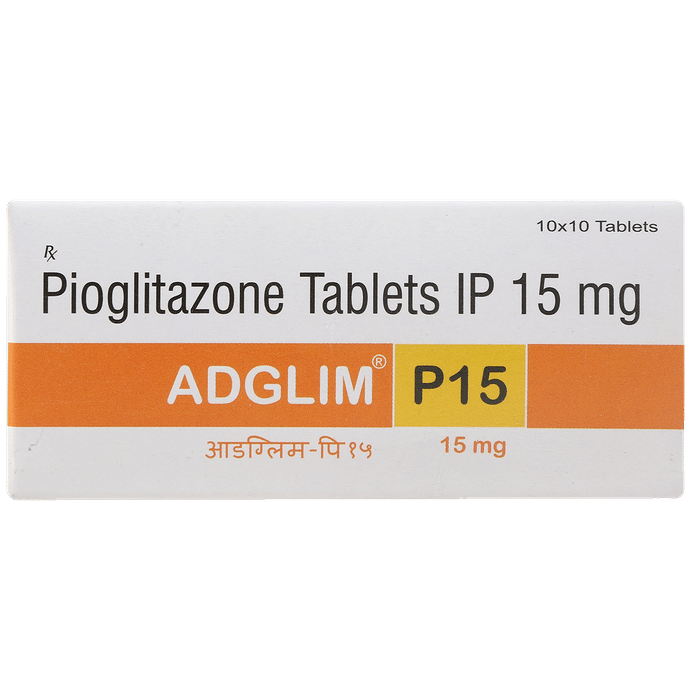 Can Adglim P 15mg Tablet cause weight gain?::: Adglim P 15mg Tablet commonly causes weight gain which may be dose-related. The reason for this weight gain could be fat accumulation. However, in heart failure patients it could be due to water retention in the body. Therefore, it is important to monitor weight in heart failure cases.| Can Adglim P 15mg Tablet cause heart failure?::: Adglim P 15mg Tablet can cause fluid retention which may aggravate or speed up heart failure. The doctor usually starts with the lowest available dose and increases the dose gradually while treating patients who have at least one risk factor for heart failure (previous heart attack, coronary artery disease, elderly). Heart failure is more common when Adglim P 15mg Tablet is used with insulin.| Can you take Adglim P 15mg Tablet and metformin together?::: Yes, Adglim P 15mg Tablet can be used with metformin where sufficient blood sugar management was not possible with metformin alone. This combination of medicines can be used in adult patients with type 2 diabetes mellitus and overweight patients with poor blood sugar control.| What time of day should you take Adglim P 15mg Tablet?::: It is usually prescribed once daily and can be taken at any time of the day but preferably at the same time each day. It can be taken with or without food. You should take Adglim P 15mg Tablet exactly as prescribed by your doctor.| How long do I need to take Adglim P 15mg Tablet? Can I stop the medicine for some time?::: Continue taking Adglim P 15mg Tablet as long as your doctor recommends taking it. Treatment for diabetes mellitus is long-term so you may have to take it lifelong. However, if you have to stop it then consult with your doctor who will suggest an alternative. Do not stop taking it without consulting your doctor as it may cause blood sugar levels to rise, which could be harmful to you.| Does Adglim P 15mg Tablet affect liver?::: Yes, Adglim P 15mg Tablet may cause an increase in liver enzymes, and treatment with Adglim P 15mg Tablet should be stopped if liver enzymes increase. Hence, levels of liver enzymes should be periodically checked while on treatment with this medicine. Adglim P 15mg Tablet should not be prescribed to patients with liver disease.| What kind of medicine is Adglim P 15mg Tablet? Is it like metformin?::: Adglim P 15mg Tablet belongs to the thiazolidinediones class of anti-diabetic medicines. It helps control blood sugar levels by improving how your body uses a hormone called insulin. This is done by helping your cells become more sensitive to the insulin your body makes.| Can Adglim P 15mg Tablet cause bladder cancer?::: Adglim P 15mg Tablet may increase the risk of bladder cancer, though it is very rare. Immediately consult your doctor if you experience blood in your urine, pain when urinating or a sudden need to urinate, during treatment with this medicine. Adglim P 15mg Tablet should not be used in patients with a prior history of bladder cancer or having bladder cancer.: