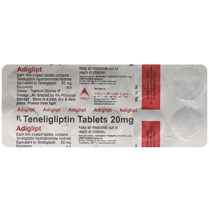 Does Adiglipt 20mg Tablet cause weight gain?::: No, Adiglipt 20mg Tablet is not known to cause weight gain by itself. However, keeping a healthy weight is an important part of managing diabetes. Consult your doctor if you experience weight gain while taking Adiglipt 20mg Tablet.| Is Adiglipt 20mg Tablet bad for your kidneys?::: No, Adiglipt 20mg Tablet is not bad for your kidneys if your kidney function is normal. However, it is important to inform your doctor if you have, or ever had, any kidney problems. If you have kidney problems, you may need dose modification.| Do I still have to manage my diet and exercise while on Adiglipt 20mg Tablet?::: Yes, it is important to manage your diet and exercise while taking Adiglipt 20mg Tablet. In addition to medicine, making healthy food choices and being physically active are also important to effectively manage blood sugar levels. You may consult a dietitian and follow a diet chart that suits you best. A well-balanced diet is one part of a healthy lifestyle for people with type 2 diabetes. Additionally, thirty minutes of exercise such as a brisk walk is recommended.| Can my blood sugar levels go too low on Adiglipt 20mg Tablet?::: Yes, it is possible that your blood sugar levels may become very low (hypoglycemia). The chances are higher if you are on any other antidiabetic medicine or insulin along with Adiglipt 20mg Tablet. Additionally, blood sugar levels can take a huge dip if you skip meals, exercise more than usual, or if you have taken an overdose of Adiglipt 20mg Tablet. If you experience a sudden fall in your sugar levels, inform your doctor. The doctor may suggest dose modification to prevent your blood sugar levels from decreasing significantly (hypoglycemia). Follow your doctor’s advice and monitor your blood sugar levels regularly.| How long do I need to take Adiglipt 20mg Tablet?::: Adiglipt 20mg Tablet only helps to manage your blood sugar levels but does not cure your diabetes. Keep taking Adiglipt 20mg Tablet as long as your doctor recommends it. You may have to take it lifelong. It is important to keep your blood sugar levels under control as any fluctuations in your blood sugar levels may cause serious problems. Therefore, do not stop taking it without talking to your doctor.| What will happen if I accidentally take more than the prescribed dose of Adiglipt 20mg Tablet?::: If you have accidentally taken more than the prescribed dose of Adiglipt 20mg Tablet, your blood sugar levels may become too low (hypoglycemia). This hypoglycemia may be mild or severe. Monitor your blood sugar levels more frequently for the next 24 hours. Mild episodes of hypoglycemia (with symptoms like anxiety, sweating, weakness, tremors, fast heartbeat) can usually be corrected with the help of sugary foods such as sugar or glucose candy, fruit juice and glucose/glucon-D. However, it is important to consult your doctor to decide the further course of treatment. More severe episodes of hypoglycemia may even lead to a seizure (fit) or unconsciousness. This can be life-threatening and immediate medical help may be required.| What if I miss a dose of Adiglipt 20mg Tablet?::: If you miss a dose, take it as soon as you remember. If in case you do not remember until it is time for your next dose, skip the missed dose and go back to your regular schedule. Do not take two doses of Adiglipt 20mg Tablet at the same time.| What is the most important information I should know about Adiglipt 20mg Tablet?::: Adiglipt 20mg Tablet is safe to use if taken in the dose and duration prescribed by the doctor. However, in rare cases, some serious side effects can also be observed. In some people, Adiglipt 20mg Tablet may cause inflammation of the pancreas (pancreatitis) which could be severe and can even lead to death. If you experience severe and persistent pain in your stomach area (abdomen), stop the medication and immediately contact your doctor. Adiglipt 20mg Tablet can also cause heart failure. This means the heart is not able to pump blood well enough, therefore, inform your doctor if you have or ever had heart problems before you start taking Adiglipt 20mg Tablet. In addition to that, problems related to kidneys should also be discussed with the doctor.| Is Adiglipt 20mg Tablet safe to be taken for a long term?::: Yes, it is safe to take Adiglipt 20mg Tablet for a long time. Its long-term use, which can continue for months, years or even lifelong, has not shown any harmful effects. Keep taking Adiglipt 20mg Tablet as long as your doctor recommends it. Remember, Adiglipt 20mg Tablet only helps to keep your blood sugar levels under control but does not cure your diabetes.: