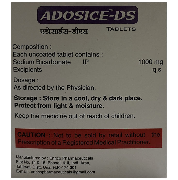 Adosice-DS Tablet is an antacid used in the treatment of indigestion, metabolic acidosis and used as an alkalinizing agent. It acts as a buffer that helps neutralize excess acid and restore a healthier pH level in the body. Adosice-DS Tablet relieves irritation by producing carbon dioxide which neutralizes the acid present in the stomach. It also increases the pH of blood and urine, thereby correcting acid indigestion, heartburn. Additionally, it helps in the removal of toxic substances from the body in certain types of poisoning.Adosice-DS Tablet may be taken with or without food in a dose and duration as advised by the doctor. Excessive intake may cause electrolyte imbalance leading to unwanted side effects. Keep taking this medicine for as long as your doctor recommends. If you stop treatment too early your symptoms may come back and your condition may worsen.Common side effects of this medicine include high sodium levels, cerebral edema, alkalosis, and hypokalemia. Let your doctor know if any of these side effects persist or get worse. They may be able to help by adjusting the dosage or by prescribing you an alternate medicine.It is important to consult a doctor before taking Adosice-DS Tablet if you are suffering from stomach and kidney disease. Let your doctor also know about all other medications you are taking as some may affect, or be affected by this medicine. Pregnant or breastfeeding women should also consult their doctor before taking this medicine.
