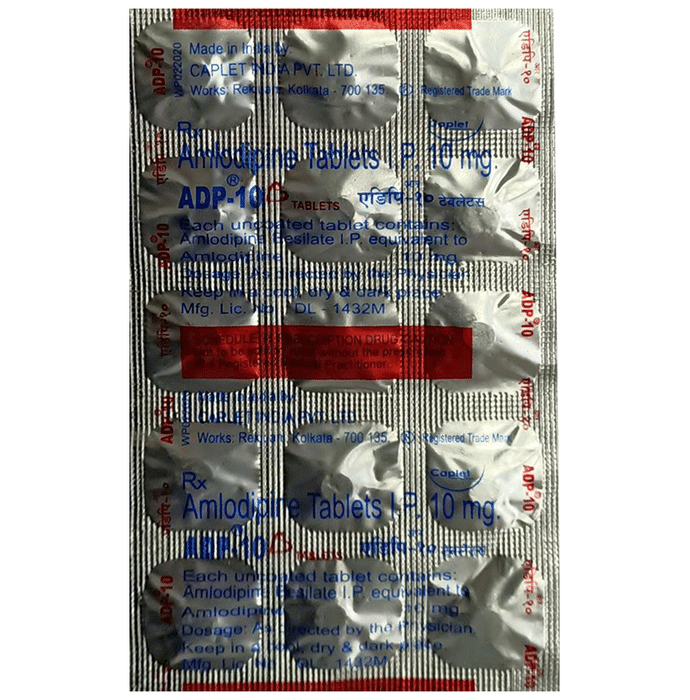 How long does it take for Adp 10 Tablet to work?::: Adp 10 Tablet starts working on the day it is taken. However, it may take weeks to see the full effect. You should continue taking the medicine even if you feel better or if you do not notice any considerable difference. Consult your doctor if you have any concerns or you feel worse after taking the medicine.| Does Adp 10 Tablet cause itching?::: Adp 10 Tablet may cause itching in some patients, though it is an uncommon side effect. However, if you experience severe itching contact your doctor.| Is Adp 10 Tablet bad for the kidneys?::: No, there is no evidence that Adp 10 Tablet causes deterioration of kidney problems. Adp 10 Tablet can be used in normal doses in patients with kidney problems. In fact, its blood pressure-lowering effect, it helps to prevent injury to the kidneys due to hypertension.| Should I take Adp 10 Tablet in the morning or at night?::: Adp 10 Tablet can be taken anytime of the day. Usually, it is advised to be taken in the morning, but your doctor may advise to take it in the evening as well. You should take it at the same time each day so that you remember to take it and consistent levels of medicine are maintained in the body.| For how long do I need to take Adp 10 Tablet?::: You should keep on taking Adp 10 Tablet for as long as your doctor has recommended you to take it. You may need to take it lifelong. Do not stop taking it, even if you feel well or your blood pressure is well controlled. If you stop taking Adp 10 Tablet, your blood pressure may increase again and your condition may worsen. | Is Adp 10 Tablet a beta-blocker?::: No, Adp 10 Tablet is not a beta-blocker. It belongs to a class of medicines known as calcium channel blockers. It lowers blood pressure by relaxing the blood vessels so that blood can easily flow through the blood vessels.| What are the serious side effects of Adp 10 Tablet?::: Adp 10 Tablet may cause some serious side effects such as liver problems (yellowing of skin, nausea, vomiting, and loss of appetite), pancreatitis (severe stomach pain, nausea, and vomiting), and recurrent chest pain which may be indicative of a heart attack. However, these side effects are rarely seen. Remember that your doctor has prescribed this medicine to you because the benefit to you is greater than the risk of any potential side effects. Follow your doctor’s advice.| What should I avoid while taking Adp 10 Tablet?::: Consult your doctor first before starting any new prescription or non-prescription medicines or supplements. Take low sodium and low-fat diet, and adhere to the lifestyle changes as advised by your doctor. Avoid eating grapefruit (chakotra) or drinking grapefruit juice while taking Adp 10 Tablet. Stop smoking and taking alcohol as this helps to lower your blood pressure and prevents heart problems.| I have developed ankle edema and swelling over my feet after using a Adp 10 Tablet. What should I do?::: Adp 10 Tablet can cause ankle or foot swelling. To reduce swelling raise your legs while you are sitting down. Talk to your doctor if it does not go away.: