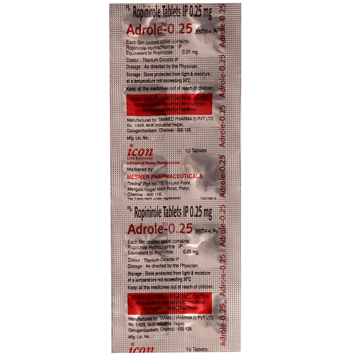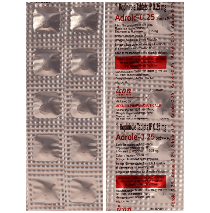 What are the warning symptoms that should prompt me to discontinue therapy?::: You may develop several warning symptoms that would suggest that the treatment needs to be discontinued. You may develop compulsive behavior such as gambling, increase in sex drive, compulsive shopping and eating. You may notice that your symptoms are getting worse (start earlier than usual or are more intense, affect other parts of the body, such as the arms, and symptoms return early in morning). If you notice these symptoms, consult your doctor immediately.| How long does Adrole 0.25mg Tablet take to work?::: You may be able to see improvement within a week. However, it may take longer and differs from individual to individual.| Can I stop taking Adrole 0.25mg Tablet if I do not see any improvement in my symptoms?::: No, you should not stop taking Adrole 0.25mg Tablet on your own as you may experience anxiety, depression, lack of interest, tiredness, sweating and severe pain in the leg. The dose should be reduced slowly. In some patients, it may take longer to see improvement but not beyond 12 weeks. Talk to your doctor if you want to stop it.| Can I take gabapentin and Adrole 0.25mg Tablet together?::: Yes, you can take gabapentin and Adrole 0.25mg Tablet together. However, be careful as taking these two medicines together may cause excessive drowsiness, dizziness and decrease your mental alertness. So, you may have to avoid driving, operating machinery or working at heights while taking the two medicines together.| Is Adrole 0.25mg Tablet used for pain?::: No, Adrole 0.25mg Tablet is not used to relieve pain. It acts by increasing the levels of a chemical messenger (dopamine) in the brain, which is deficient in case of restless leg syndrome. This, in turn, relieves the discomfort and reduces the involuntary limb movements that disrupt night-time sleep.| How often can I take Adrole 0.25mg Tablet?::: For restless leg syndrome, take Adrole 0.25mg Tablet once a day. It is usually taken just before bedtime, but you can take it up to 3 hours before going to bed. For Parkinson’s disease, it is usually taken three times a day.| Is Adrole 0.25mg Tablet safe?::: Yes, Adrole 0.25mg Tablet is safe if taken in the dose and duration advised by your doctor. It is a well-tolerated medicine. The common side effects of Adrole 0.25mg Tablet are nausea, dizziness, headache, and sleepiness which are typically worse during the first two weeks of treatment and may require dose reduction but rarely discontinuation of drug.: