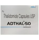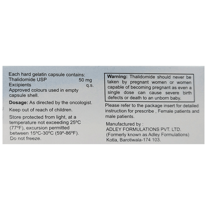 Adthal 50 Capsule is used in the treatment of multiple myeloma and lepra reaction. This medicine belongs to a group of medicines which affect how your immune system works. Adthal 50 Capsule should be taken in the exact dose and duration recommended by the doctor. You should continue to take it as long as your doctor advises for it. The duration of treatment varies according to your need and response to treatment. Before taking Adthal 50 Capsule inform your doctor if you are suffering from any heart disease. Your doctor may get regular blood tests to check number of blood cells during your treatment. It may reduce white blood cells thereby, increasing the susceptibility to infections. Common side effects of this medicine include nausea, rash, breathlessness, dizziness, edema (swelling), fatigue, and confusion. Let your doctor know if any of these side effects bothers you or get worse. They may be able to suggest ways to treat or prevent them. You should not drive or operate machinery as Adthal 50 Capsule may makes you feel sleepy. Women or men who are undergoing treatment should use effective contraception method and avoid pregnancy till doctor recommends it.