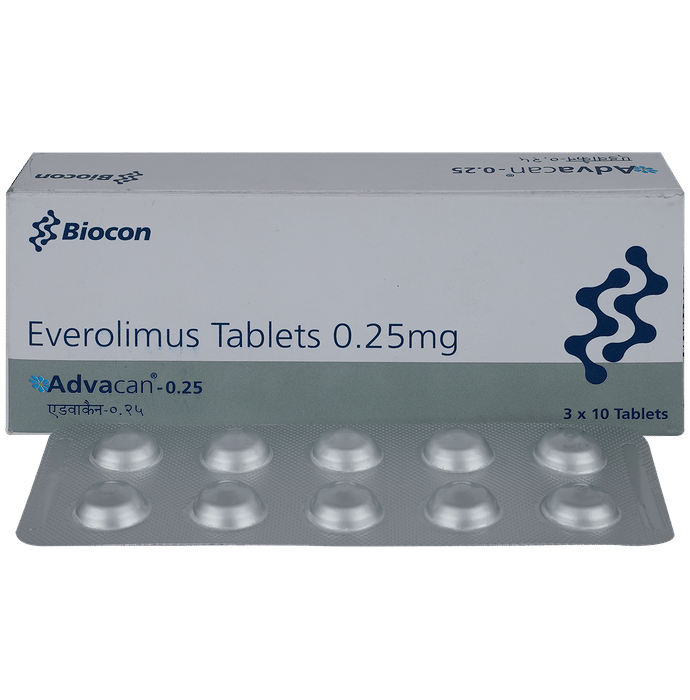 Is any monitoring required while taking Advacan 0.25mg Tablet?::: Regular monitoring is required while you are on Advacan 0.25mg Tablet. The doctor will advise blood tests to see the counts of red blood cells, white blood cells, and platelets since the counts may decrease during treatment with Advacan 0.25mg Tablet. Also, blood tests will be required to check your kidney function, liver function, blood glucose levels, and cholesterol levels.| What should I avoid while taking Advacan 0.25mg Tablet?::: You should avoid grapefruit or grapefruit juice while taking Advacan 0.25mg Tablet. This is because taking them together may increase the levels of Advacan 0.25mg Tablet in your blood to harmful levels. Avoid the use of live vaccinations and any possible contact with individuals who have received live vaccinations.| What is the most important information I need to know about Advacan 0.25mg Tablet?::: Advacan 0.25mg Tablet can cause serious side effects which include severe allergic reactions, angioedema, and kidney failure which can be severe and can lead to death. It is possible that you may develop an infection or problems related to lung such as breathing problems.| Is Advacan 0.25mg Tablet a chemotherapy?::: Advacan 0.25mg Tablet is an anticancer medicine. It belongs to kinase inhibitor class of medicines. It works by reducing the blood supply to the tumor, which slows down the growth and spread of cancer cells.| How is Advacan 0.25mg Tablet administered?::: Usually, Advacan 0.25mg Tablet is taken once or twice daily. The medicine should always either be taken with food or always be taken without food. Advacan 0.25mg Tablet should be swallowed whole with water and should not be crushed or chewed.| How long can you take Advacan 0.25mg Tablet?::: There is no definite duration of treatment with Advacan 0.25mg Tablet. Advacan 0.25mg Tablet is continued till clinical benefit is seen or unacceptable toxicity or side effects occur.| How will I know that Advacan 0.25mg Tablet is shrinking my brain tumor?::: The effect of Advacan 0.25mg Tablet in shrinking the size of tumor can only be checked by getting regular brain scans. It should be done as advised by your doctor and your treatment plan.| Is Advacan 0.25mg Tablet cytotoxic?::: Yes, Advacan 0.25mg Tablet is cytotoxic against human cancer cells of breast, stomach, prostate, and kidneys (renal cell carcinoma).| Is Advacan 0.25mg Tablet a chemotherapy?::: Advacan 0.25mg Tablet is an anticancer medicine. It belongs to kinase inhibitor class of medicines. It works by reducing the blood supply to the tumor, which slows down the growth and spread of cancer cells.| How is Advacan 0.25mg Tablet administered?::: Usually, Advacan 0.25mg Tablet is taken once or twice daily. The medicine should always either be taken with food or always be taken without food. Advacan 0.25mg Tablet should be swallowed whole with water and should not be crushed or chewed.| How long can you take Advacan 0.25mg Tablet?::: There is no definite duration of treatment with Advacan 0.25mg Tablet. Advacan 0.25mg Tablet is continued till clinical benefit is seen or unacceptable toxicity or side effects occur.| Is any monitoring required while taking Advacan 0.25mg Tablet?::: Regular monitoring is required while you are on Advacan 0.25mg Tablet. The doctor will advise blood tests to see the counts of red blood cells, white blood cells, and platelets since the counts may decrease during treatment with Advacan 0.25mg Tablet. Also, blood tests will be required to check your kidney function, liver function, blood glucose levels, and cholesterol levels.| How will I know that Advacan 0.25mg Tablet is shrinking my brain tumor?::: The effect of Advacan 0.25mg Tablet in shrinking the size of tumor can only be checked by getting regular brain scans. It should be done as advised by your doctor and your treatment plan.| What should I avoid while taking Advacan 0.25mg Tablet?::: You should avoid grapefruit or grapefruit juice while taking Advacan 0.25mg Tablet. This is because taking them together may increase the levels of Advacan 0.25mg Tablet in your blood to harmful levels. Avoid the use of live vaccinations and any possible contact with individuals who have received live vaccinations.| What is the most important information I need to know about Advacan 0.25mg Tablet?::: Advacan 0.25mg Tablet can cause serious side effects which include severe allergic reactions, angioedema, and kidney failure which can be severe and can lead to death. It is possible that you may develop an infection or problems related to lung such as breathing problems.| Is Advacan 0.25mg Tablet cytotoxic?::: Yes, Advacan 0.25mg Tablet is cytotoxic against human cancer cells of breast, stomach, prostate, and kidneys (renal cell carcinoma).: