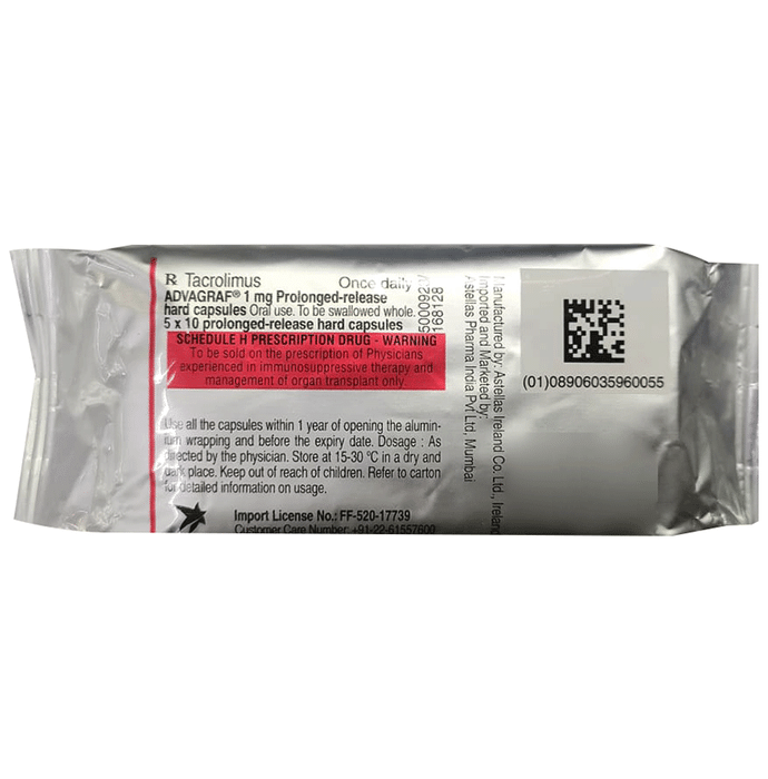 Is Advagraf 1mg Capsule PR (10 Capsules each) an antibiotic?::: Yes, Advagraf 1mg Capsule PR (10 Capsules each) is a type of antibiotic which belongs to a group of medicines called macrolides. It is mostly used after organ transplantation. This medicine’s immune-suppressing property helps prevent organ rejection after kidney, heart, or liver transplant.| Which vaccines should not be taken while taking Advagraf 1mg Capsule PR (10 Capsules each)?::: You should avoid taking any live vaccines (vaccines that use pathogens that are still alive, but are attenuated, that is, weakened) while taking Advagraf 1mg Capsule PR (10 Capsules each). These may include vaccinations for measles, mumps, rubella, BCG (TB vaccine), yellow fever, chicken pox and typhoid. You should also avoid taking polio drops (by mouth) or flu vaccine (through nose).| Who should not take Advagraf 1mg Capsule PR (10 Capsules each)?::: Patients who are allergic to it or have a weak immune system, high blood pressure, and kidney failure should avoid Advagraf 1mg Capsule PR (10 Capsules each). This medicine should also be avoided in pregnant or breastfeeding women, and in people who plan to receive any live vaccines (e.g. MMR vaccine).| What should I tell my doctor before taking Advagraf 1mg Capsule PR (10 Capsules each)?::: Inform your doctor if you are pregnant, have allergies, long-term infection, high blood sugar, or high blood pressure. You should also inform your doctor if you have high blood potassium levels or a weakened immune system. Tell your doctor if you have a history of any medication, have recently received, or are scheduled to receive a live vaccine. | What should I be aware of before I start taking Advagraf 1mg Capsule PR (10 Capsules each)?::: This medicine suppresses the immune system and hence there is always an increased risk of infection. Moreover, in some cases, Advagraf 1mg Capsule PR (10 Capsules each) can increase the risk of some kind of cancer like skin and lymph gland cancer (lymphoma). It can lower the ability of your immune system to fight infections. Consult your doctor before you start taking this medication and in case you notice any symptoms of infections like fever, sweats or chills, cough or flu-like symptoms, muscle aches, warm, red, or painful areas on your skin. | Does Advagraf 1mg Capsule PR (10 Capsules each) have an abuse potential?::: No, Advagraf 1mg Capsule PR (10 Capsules each) does not have abuse potential and thus, is not a controlled substance. Controlled substances have potential for abuse so they need permission from authorities and doctors for use.:
