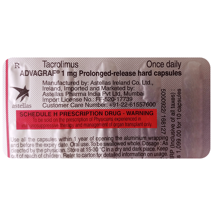 Advagraf 1mg Capsule PR is used along with other medicines to prevent your body from rejecting a new organ (e.g., liver, kidney, or heart) after transplant. It does so by weakening your body’s immune system, so it does not attack the new organ. This medication belongs to a class of drugs known as immunosuppressants. The amount of Advagraf 1mg Capsule PR you take and how often you take it depends on the type of transplant you have, your body weight, and what other medicines you are taking. Follow your doctor’s instructions carefully. You should take it on an empty stomach, at least 1 hour before or 2 hours after a meal. Take this medicine regularly to get the maximum benefit and keep taking it, even if you feel well. If you stop taking it, you may increase the chances of rejecting your transplanted organ.Advagraf 1mg Capsule PR has many potential side effects. It can cause or worsen diabetes and kidney problems. These need urgent medical attention. Other common side effects include tremor, infections, high blood pressure, headache, and insomnia. If the side effects do not go away or get worse, tell your doctor. Advagraf 1mg Capsule PR lowers your immune system making you susceptible to catching more infections than usual.Before taking this medicine, tell your doctor if you have kidney, liver, or heart problems, diabetes, or high blood pressure. Also let your doctor know what other medications you are taking, especially for infections, pain, and arthritis. These and others may affect, or be affected by, this medicine. You should limit your exposure to the sun and UV (ultraviolet) light while taking it because immunosuppressants could increase your risk of skin cancer.Both men and women using this medicine should use effective birth control to prevent pregnancy. This medicine is not normally recommended during pregnancy or while breastfeeding unless it is clearly needed. Before and during treatment you will need frequent medical tests to monitor your progress, and your blood pressure will need to be checked often.