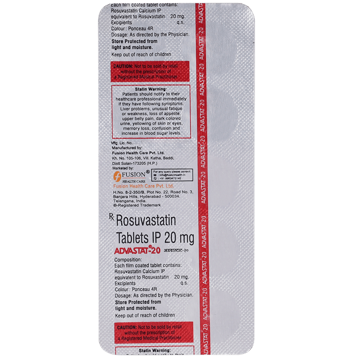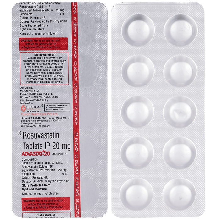 For how long should I take Advastat 20 Tablet?::: You may need to take Advastat 20 Tablet for life or for as long as directed by your doctor. The cholesterol levels will be maintained only till you are taking Advastat 20 Tablet. Stopping Advastat 20 Tablet without starting a different treatment may increase your cholesterol levels again. This medicine has only a few side effects and is usually considered safe if taken as directed by the doctor.| Does Advastat 20 Tablet cause weight gain?::: No, there is no evidence of Advastat 20 Tablet causing weight gain. If you are taking Advastat 20 Tablet and gaining weight, consult your doctor. The doctor may get some investigations done to know the reason for the weight gain.| Does Advastat 20 Tablet make you tired?::: Yes, Advastat 20 Tablet can make you feel tired. This is because it reduces the energy supply to the muscles in the body. However, the exact reason behind the phenomenon is unknown and needs more research. Tiredness usually occurs after exertion. Generalized fatigue is more often in people with heart disease or those suffering from liver illness. Advastat 20 Tablet also causes muscle damage which further worsens the tiredness. Therefore, you must consult your doctor if you feel tired while taking Advastat 20 Tablet.| Should Advastat 20 Tablet be taken at night?::: Advastat 20 Tablet should be taken once a day. It can be taken in the morning or at night or any time of the day, with or without food. Try taking this medicine at the same time every day. Doing this will help you remember to take it daily.| What foods should be avoided when taking Advastat 20 Tablet?::: Advastat 20 Tablet is used to decrease your blood cholesterol levels. Therefore, to seek the best results of this medicine, you should avoid foods that are high in calories like fried food and junk food. It is recommended to eat a low-fat and low-cholesterol diet. Be sure to follow all the exercise and dietary recommendations made by your doctor or dietician.| How do I know whether Advastat 20 Tablet is beneficial for me or not?::: All medicines have side effects, but the benefits of Advastat 20 Tablet in reducing cholesterol levels and the risk of heart attack and stroke are proven by a large number of studies. However, if you do have any concerns, then discuss it with your doctor. Your doctor will consider and explain to you the benefits of taking Advastat 20 Tablet versus the risks of not taking it at all.| Can Advastat 20 Tablet cause memory loss?::: Advastat 20 Tablet may cause memory loss in very rare cases. This is generally non-serious and may occur within 1 day of taking this medicine or may take years to appear. These symptoms may disappear within about 3 weeks of discontinuing Advastat 20 Tablet. However, you should consult your doctor if you experience this side effect as it could be due to some other reason.| Can Advastat 20 Tablet cause muscle problems or muscle injury?::: Yes, taking Advastat 20 Tablet can cause muscle problems or muscle injury. This is because of the reduced oxygen supply to the muscle cells which leads to fatigue, muscle pain, tenderness or muscle weakness. The soreness may be significant enough to interfere with your daily activities. Do not take it lightly and consult your doctor to know about ways to prevent this and to avoid making it worse.| Is it true that Advastat 20 Tablet can cause diabetes?::: If you are at high risk of developing type 2 diabetes, taking Advastat 20 Tablet may slightly increase this risk. This is because Advastat 20 Tablet has the potential to cause a slight increase in your blood sugar levels. If you already have type 2 diabetes, your doctor may advise you to keep monitoring your blood sugar levels closely for the first few months. Tell your doctor if you find it harder to control your blood sugar.: