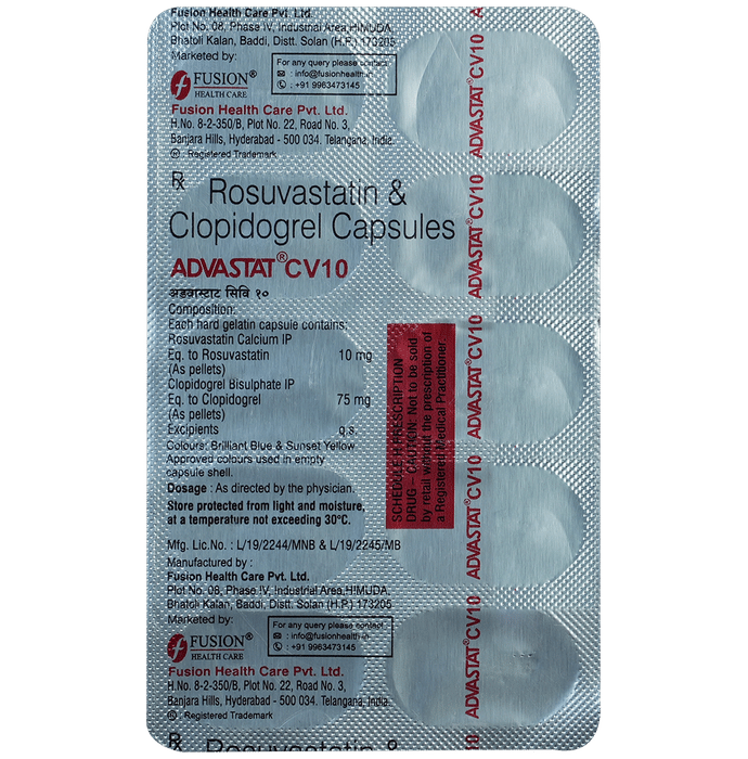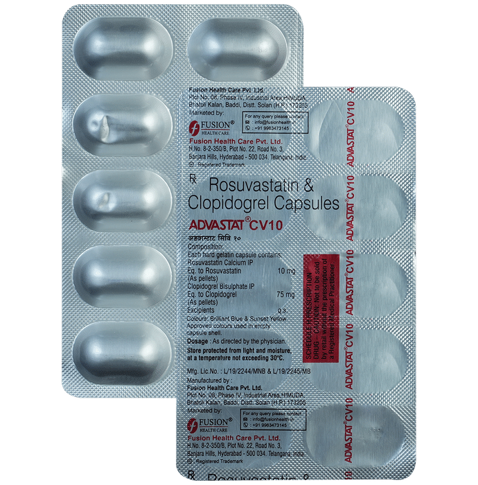 Can the use of Advastat CV 10 Capsule increase the risk of bleeding?::: Yes, Advastat CV 10 Capsule increases the risk of bleeding. Always be careful while doing activities that may cause an injury or bleeding. Tell your doctor immediately if you notice any abnormal bruising or bleeding.| What medicines should I avoid while taking Advastat CV 10 Capsule?::: Advastat CV 10 Capsule can interact with several medicines and can cause serious problems. Talk to your doctor and inform him about using Advastat CV 10 Capsule before taking any prescription or non-prescription medicine.| Can Advastat CV 10 Capsule cause muscle pain?::: Yes, Advastat CV 10 Capsule can cause muscle pain by injuring muscles. Talk to your doctor as soon as possible if you experience muscle pain, weakness or muscle cramps. It can be a sign of any muscle injury caused due to Advastat CV 10 Capsule.| Will I need to stop Advastat CV 10 Capsule before surgery or dental procedure?::: Advastat CV 10 Capsule may increase the risk of bleeding during a surgery or dental procedure. Therefore, you may be asked by your doctor to stop taking Advastat CV 10 Capsule. You should not stop taking Advastat CV 10 Capsule on your own. | What lifestyle changes should be adopted while taking Advastat CV 10 Capsule?::: Making lifestyle changes can boost your health while taking Advastat CV 10 Capsule. Stop smoking, as smoking increases your risk of having a heart attack and stroke. If you are overweight or obese, try to lose weight. You should maintain a healthy diet by including fruits and vegetables in your meals. Regular exercise can make your heart strong and decrease your risk of heart attack.| Which painkiller is safe while taking Advastat CV 10 Capsule?::: Paracetamol is safe to use while taking Advastat CV 10 Capsule for relieving pain. Avoid the use of other painkillers while taking Advastat CV 10 Capsule, as they may increase the risk of bleeding.: