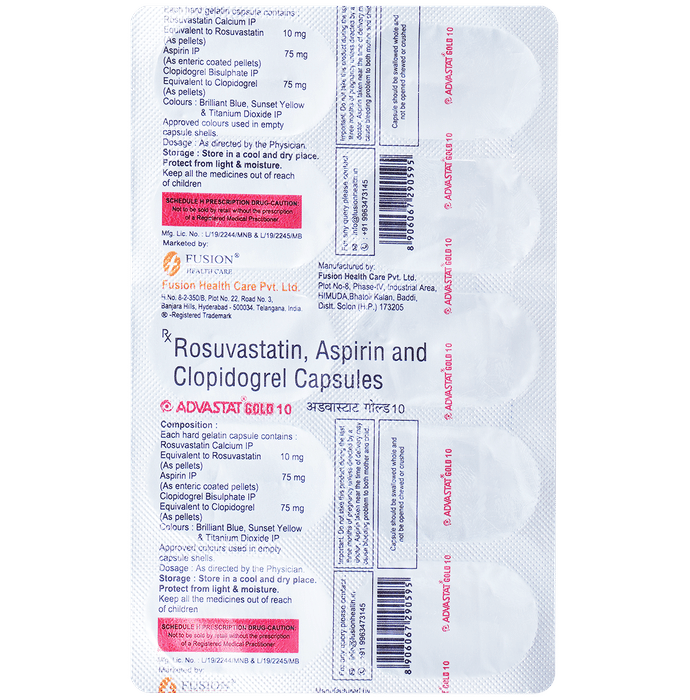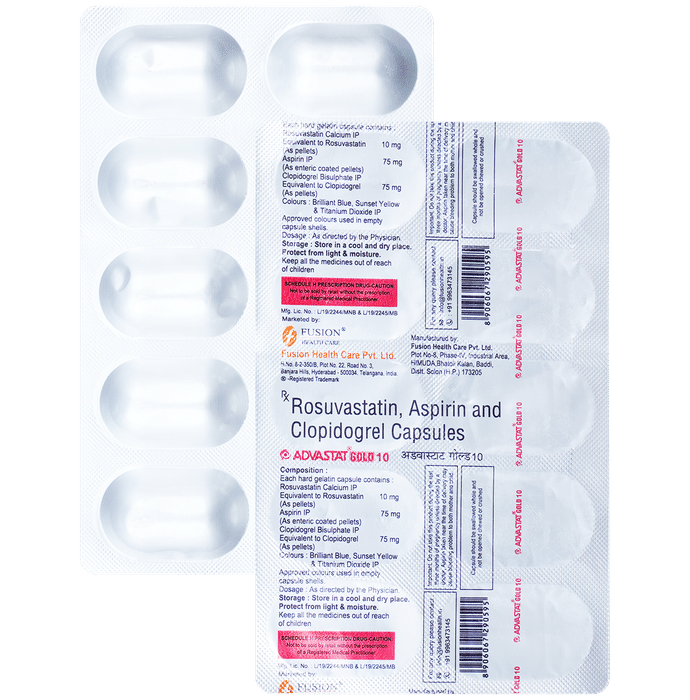 What are the instructions for the storage and disposal of Advastat Gold 75mg/10mg/75mg Capsule?::: Keep this medicine in the packet or the container it came in, tightly closed. Store it according to the instructions mentioned on the pack or label. Dispose of the unused medicine. Make sure it is not consumed by pets, children and other people.| Will I need to stop Advastat Gold 75mg/10mg/75mg Capsule before surgery or dental procedure?::: Advastat Gold 75mg/10mg/75mg Capsule may increase the risk of bleeding during a surgery or dental procedure. Therefore, you may be asked by your doctor to stop taking Advastat Gold 75mg/10mg/75mg Capsule. However, do not stop taking Advastat Gold 75mg/10mg/75mg Capsule on your own.| What are the lifestyle changes to adapt while taking Advastat Gold 75mg/10mg/75mg Capsule?::: Making lifestyle changes can boost your health while taking Advastat Gold 75mg/10mg/75mg Capsule. Stop smoking, as smoking increases your risk of having a heart attack and stroke. If you are overweight or obese, try to lose weight. You should maintain a healthy diet by including fruits and vegetables in your meals. Regular exercise can make your heart strong and decrease your risk of heart attack.| Which painkiller is safe while taking Advastat Gold 75mg/10mg/75mg Capsule?::: Paracetamol is safe to use while taking Advastat Gold 75mg/10mg/75mg Capsule for relieving pain. Avoid the use of other painkillers while taking Advastat Gold 75mg/10mg/75mg Capsule, as they may increase the risk of bleeding.| Can the use of Advastat Gold 75mg/10mg/75mg Capsule increase the risk of bleeding?::: Yes, Advastat Gold 75mg/10mg/75mg Capsule increases the risk of bleeding. Always be careful while doing activities that may cause an injury or bleeding. Tell your doctor immediately if you notice any abnormal bruising or bleeding.: