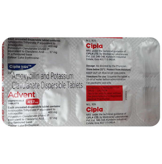 Can other medicines be given at the same time as Advent 457mg Tablet DT Tangy Orange?::: Advent 457mg Tablet DT Tangy Orange can sometimes interact with other medicines or substances. Tell your doctor about any other medicines your child is taking before starting Advent 457mg Tablet DT Tangy Orange. Also, check with your child’s doctor before giving any medicine to your child.| Can I get my child vaccinated while on treatment with Advent 457mg Tablet DT Tangy Orange?::: Antibiotics usually do not interfere with the ingredients in vaccines or cause a bad reaction in a child who has just been vaccinated. However, children taking antibiotics should not get vaccinated until they recover from the illness. As soon as your child feels better, the vaccine can be given.| Which lab tests may my child undergo while taking Advent 457mg Tablet DT Tangy Orange on a long-term basis?::: With prolonged therapy, the doctor may monitor kidney and liver function tests periodically to keep a check on your child’s condition.| Can I give a higher than the recommended dose of Advent 457mg Tablet DT Tangy Orange to my child?::: No, giving a higher than recommended dose of this medicine can increase the risks of side effects. If your child experiences increased severity of symptoms, please consult your doctor for re-evaluation.| Can I stop giving Advent 457mg Tablet DT Tangy Orange to my child when the symptoms are relieved?::: No, do not stop giving this medicine to your child unless the full course of the treatment is complete, even if you feel better. The symptoms may improve before the infection is completely cured. Hence, continue giving the medicine for the due course as it may still be showing beneficial effects.| Can the use of Advent 457mg Tablet DT Tangy Orange cause diarrhea?::: Yes, Advent 457mg Tablet DT Tangy Orange may cause diarrhea. It is an antibiotic that kills harmful bacteria. In addition to that, the medicine may also affect the helpful bacteria in your child’s stomach and cause diarrhea. In case of diarrhea, encourage your child to drink plenty of water or other fluids. Talk to your doctor if diarrhea persists and you notice any signs of dehydration, like less frequency of urination with dark colored and strong-smelling urine. Do not give any other medicine to your child without consulting a doctor.| Do all viral common colds result in secondary bacterial infection?::: Most of the time, bacterial infections do not follow viral infections. In fact, giving antibiotics in viral infection can increase your child’s risk of developing side effects. So, use antibiotics only after consulting with your child’s doctor.| The mucus coming out of my child’s nose is yellow-green. Is it a sign of a bacterial infection?::: Yellow or green mucus in the nose does not mean that antibiotics are needed. During a common cold, it is normal for mucus to thicken up and change from clear to yellow or green. Symptoms often last for 7-10 days.| Is there any sign which shows that my child needs immediate medical attention?::: You must call your child’s doctor right away if your child experiences serious allergic reactions (breathing problems, skin rashes), gastrointestinal infections (diarrhea), and liver damage (weakness, paleness, vomiting). Though rare, these side effects are serious and need an expert’s attention.: