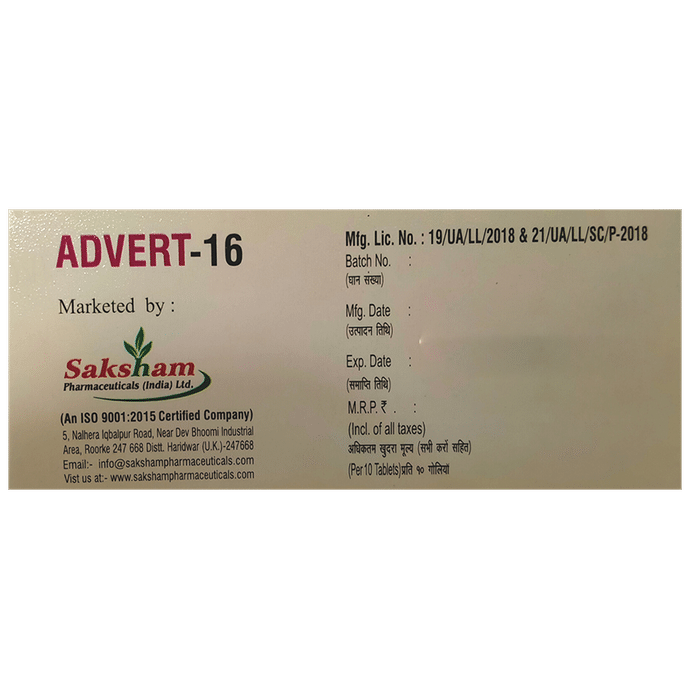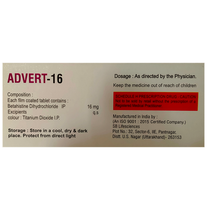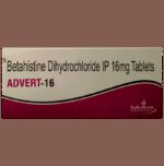 What is Meniere’s disease? Does it go away?::: Meniere’s disease is a disorder of the balance and hearing organs in the inner ear. The symptoms include vertigo, fluctuations in hearing, tinnitus (ringing of the ears), and pressure in the ears. Along with that, one may experience dizziness which in turn may cause nausea and vomiting. The treatment for Meniere’s disease depends on various factors. Hence, an open discussion with the doctor can help to determine the best treatment strategy in your personal case.| Is Advert 16 Tablet effective?::: Advert 16 Tablet is effective if used in the dose and duration advised by your doctor. Do not stop taking it even if you see improvement in your condition. If you stop using Advert 16 Tablet too early, the symptoms may return or worsen.| What are the triggers for Meniere’s disease?::: Meniere’s disease can be triggered by conditions like stress, overwork, fatigue, emotional distress, additional illnesses, and pressure changes. Along with that, certain foods such as dairy products, caffeine, alcohol, and foods with high sodium content may trigger Meniere’s disease. A 2-gram/day low-salt diet can help control vertigo in Meniere’s disease.| What if I forget to take a dose of Advert 16 Tablet?::: If you forget a dose of Advert 16 Tablet, take it as soon as you remember. However, if it is almost time for your next dose, skip the missed dose and take the next dose at the scheduled time. Do not double the dose to make up for the missed one as this may increase the chances of developing side effects.| Is stress a reason for vertigo?::: Mental stress can trigger vertigo. It can make many forms of vertigo worse, but will not, by itself, produce vertigo.| What are the causes of vertigo?::: Vertigo may be caused either by a sudden drop in blood pressure or because of being dehydrated. Many people feel lightheaded if they get up too quickly from sitting or lying down. Along with that, motion sickness, certain medicines, and problems with your inner ear (Meniere’s disease, acoustic neuroma) may cause vertigo. It is important to know that sometimes vertigo can be a symptom of other disorders (multiple sclerosis, following head trauma) as well.| How long should Advert 16 Tablet be taken?::: Duration of treatment with Advert 16 Tablet may vary from patient to patient. Some people respond rapidly to treatment while others may take some time. Hence, it is advised to take your tablets regularly and wait for the results patiently. Consult the doctor if not sure.| What are the common side effects of Advert 16 Tablet?::: Advert 16 Tablet can cause mild stomach problems such as vomiting, stomach pain, stomach swelling (abdominal distension), and bloating. You can reduce the chances of getting these side effects by taking Advert 16 Tablet with food. However, the absorption of Advert 16 Tablet may get reduced when taken with food.| Is Advert 16 Tablet effective?::: Advert 16 Tablet is effective if used in the dose and duration advised by your doctor. Do not stop taking it even if you see improvement in your condition. If you stop using Advert 16 Tablet too early, the symptoms may return or worsen.| What if I forget to take a dose of Advert 16 Tablet?::: If you forget a dose of Advert 16 Tablet, take it as soon as you remember. However, if it is almost time for your next dose, skip the missed dose and take the next dose at the scheduled time. Do not double the dose to make up for the missed one as this may increase the chances of developing side effects.| How long should Advert 16 Tablet be taken?::: Duration of treatment with Advert 16 Tablet may vary from patient to patient. Some people respond rapidly to treatment while others may take some time. Hence, it is advised to take your tablets regularly and wait for the results patiently. Consult the doctor if not sure.: