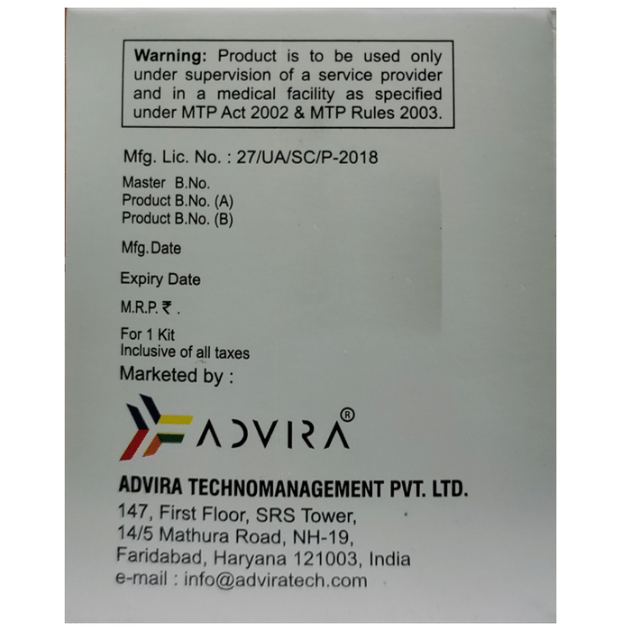What is Advibort Tablet Combikit and what is it used for?::: Advibort Tablet Combikit contains two medicines, Mifepristone, and Misoprostol. Advibort Tablet Combikit is used for medical termination of pregnancy. It is only used to terminate a pregnancy which should not be more than 63 days old, counting from the first day of the last menstrual period.| How and in what dose should I take Advibort Tablet Combikit?::: Advibort Tablet Combikit should only be taken as per the advice of the doctor. The course is started with Mifepristone. Misoprostol is advised after 36-48 hours of taking Mifepristone. However, Misoprostol should only be taken under the supervision of a gynecologist, at a clinic or hospital setting.| What should I expect after completing my course of Advibort Tablet Combikit?::: After taking Mifepristone, you may or may not experience vaginal bleeding. However, you may experience abdominal cramping, diarrhea, stomach pain, and nausea immediately after taking Misoprostol. You may also have vaginal bleeding within 4 hours of taking Misoprostol. You may also be asked to stay at the clinic or healthcare center for at least 3 hours after taking this medicine. After 14 days of taking Mifepristone (pill you took before Misoprostol), your gynecologist may run some blood tests or perform ultrasonography to confirm whether pregnancy has been terminated or not.| Can Advibort Tablet Combikit affect my future chances of getting pregnant?::: No, studies have shown that this medicine does not impair the fertility of the women. Your future chances of getting pregnant are as equal as those who have not taken this medicine.| What are the common side effects of taking Advibort Tablet Combikit?::: The common side effects of using Advibort Tablet Combikit are abdominal pain, abdominal cramping, nausea, diarrhea, dizziness, uterine contractions, pelvic pain, and shivering. If you experience a very heavy vaginal bleeding or if any of these side effects bother you please consult with your gynecologist.: