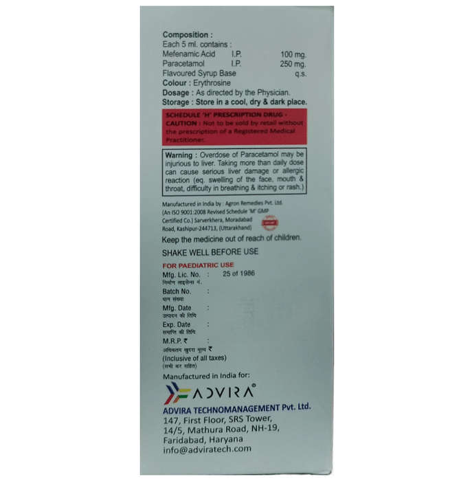 Is it safe to use Advimef P Oral Suspension?::: Yes, Advimef P Oral Suspension is safe to use in most of the patients. However, in some patients it may cause some unwanted common side effects like nausea, vomiting, stomach pain, heartburn, diarrhea and other uncommon and rare side effects. Inform your doctor if you experience any persistent problem due to the medication.| Can Advimef P Oral Suspension be stopped when the pain is relieved?::: Advimef P Oral Suspension is usually used for short term and can be discontinued when the pain is relieved. However, if advised by the doctor, it should be continued for the recommended time period.| Can the use of Advimef P Oral Suspension cause nausea and vomiting?::: Yes, the use of Advimef P Oral Suspension can cause nausea and vomiting. Taking it with milk, food or antacids can prevent nausea. Avoid taking fatty or fried foods along with the medicine. In the case of vomiting, drink plenty of water or other fluids by taking small and frequent sips. Talk to the doctor if vomiting persists and you notice signs of dehydration, like dark colored and strong-smelling urine and a low frequency of urination. Do not take any other medicine without speaking to your doctor.| Can the use of Advimef P Oral Suspension cause dizziness?::: Yes, the use of Advimef P Oral Suspension can cause dizziness (feeling faint, weak, unsteady or lightheaded) in some patients. If you feel dizzy or lightheaded, it is better to rest for some time and resume once you feel better. Do not drive or use any machines.| Are there any specific contraindications associated with the use of Advimef P Oral Suspension?::: The use of Advimef P Oral Suspension is considered to be harmful for patients with known allergy to any of the components or excipients of this medicine or in patients with known allergy to other painkillers (NSAIDs). The use of this medicine should preferably be avoided in patients with a history of stomach ulcer or in patients with active, recurrent stomach ulcer/bleeding. It should also be avoided in patients with a history of liver or kidney disease.| Can I take Advimef P Oral Suspension with vitamin B-complex?::: Yes, Advimef P Oral Suspension can be taken with Vitamin B-complex preparations. While Advimef P Oral Suspension helps to relieve pain, Vitamin B-complex can help correct the vitamin deficiency that might be causing the underlying painful condition.| Can the use of Advimef P Oral Suspension cause damage to kidneys?::: Yes, the long-term use of Advimef P Oral Suspension can cause damage to the kidneys. Normal kidneys produce a chemical called prostaglandins that protect the kidneys from damage. Use of painkillers lower the levels of prostaglandins in the body which leads to kidney damage on long-term use. Use of painkillers is not recommended to patients with underlying kidney disease.| Is it safe to take a higher than the recommended dose of Advimef P Oral Suspension?::: No, taking a higher than the recommended dose of Advimef P Oral Suspension can increase the risks of side effects like nausea, vomiting, heartburn, indigestion, diarrhea and can also damage the kidneys on long-term use. If you are experiencing increased severity of pain or the pain is not relieved by the recommended doses, please consult your doctor for re-evaluation.| What are the storage condition for Advimef P Oral Suspension?::: Keep this medicine in the container or the pack it came in, tightly closed. Store it according to the instructions mentioned on the pack or label. Dispose of the unused medicine. Make sure it is not consumed by pets, children and other people.: