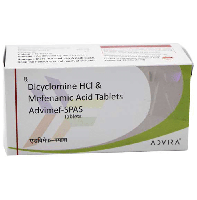 Can Advimef Spas 10mg/250mg Tablet be taken with food?::: It is advisable to take Advimef Spas 10mg/250mg Tablet with food or immediately after food since this medicine may cause stomach upset. | Can Advimef Spas 10mg/250mg Tablet stop menstruation?::: No, Mefspas does not have any effect on menstrual bleeding, neither does it affect the amount nor the duration of bleeding. It does not affect the menstrual cycle and helps relieve the pain caused due to menstrual cramps.| How long should I take Advimef Spas 10mg/250mg Tablet?::: Advimef Spas 10mg/250mg Tablet is not prescribed to be taken on a regular basis. Therefore, it is advised to take Advimef Spas 10mg/250mg Tablet for the shortest possible time advised by the doctor or only when you experience menstrual pain.| Is there any harm if I drive after taking the medicine? ::: Yes, you should try to avoid driving after taking Advimef Spas 10mg/250mg Tablet as this medicine may cause dizziness or sleepiness. These side effects get worse with the consumption of alcohol. Hence, better to avoid driving or any attention-seeking activity until you know how the medicine affects you.:
