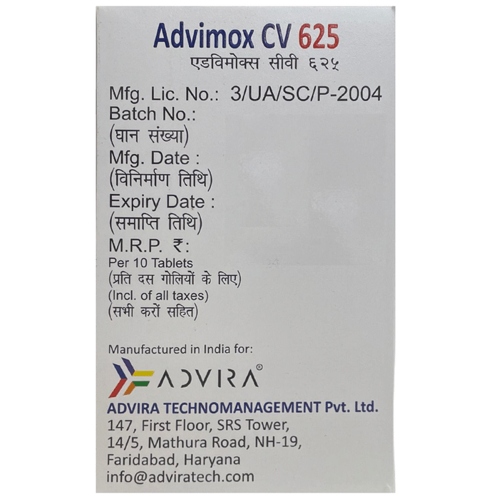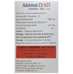 Advimox CV 500mg/125mg Tablet is a combination medicine that is used to treat various types of bacterial infections. It fights against the microorganisms to prevent their growth and further spread of the infection. Advimox CV 500mg/125mg Tablet is a prescription medicine. It is advised to take it as per the prescription. It can be taken with or without food, but it must be taken at a fixed time to ensure better efficacy. Do not consume more than the recommended dose, as this may have harmful effects on your body. If you miss a dose, take it as soon as you remember. The course of the treatment must be completed even if you feel better. Sudden discontinuation of the treatment may affect the potency of the medicine.Some common side effects of this medicine are nausea, vomiting, diarrhea, indigestion, etc. If any of the side effects get aggravated, you must consult your doctor immediately. If you experience any allergic reaction (rashes, itching, swelling, shortness of breath, etc.), you must seek immediate medical help.Before taking this medicine, you should tell your doctor if you are taking any medicines for any health condition. Pregnant or breastfeeding women should also consult with their doctor before taking it. Avoid drinking alcohol as it can cause excessive drowsiness with this medicine. It usually does not impair your ability to drive, but you should not drive if it makes you feel sleepy or dizzy. You must take adequate rest for a faster recovery, also take a healthy diet and drink plenty of water. Your doctor may ask for a few laboratory and diagnostic tests to know the effects of the medicine on your body.
