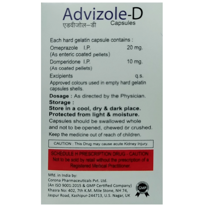 Is it safe to use Advizole D Capsule?::: Yes, Advizole D Capsule is safe for most of the patients. However, in some patients it may cause common side effects like diarrhea, stomach pain, flatulence, dryness in the mouth, dizziness, headache and other uncommon and rare side effects. Inform your doctor if you experience any persistent problem while taking this medicine.| What are the contraindications of Advizole D Capsule?::: The use of Advizole D Capsule is considered to be harmful in patients with a known hypersensitivity to omeprazole or domperidone or any other inactive ingredients present in the medicine. Cautious use is advised in patients with underlying kidney or liver disease.| What is the best time to take Advizole D Capsule?::: It is best to take the medicine daily before breakfast or on an empty stomach.| Can the use of Advizole D Capsule cause abnormal heartbeat?::: Yes, the use of Advizole D Capsule can cause an increased risk of irregular heartbeat (serious arrhythmias). These are serious side effects but the chances that it may happen is very low. The risk may be slightly higher in those who are more than 60 years of age.| Does the use of Advizole D Capsule lead to dry mouth?::: Yes, the use of Advizole D Capsule can cause dry mouth. Dryness of mouth occurs due to Domperidone, which is present in this combination. If you experience dry mouth, drink plenty of water. Take regular sips of water during the day and keep some water on your bedside at night. Cut down the intake of alcohol and avoid smoking. If you have dry mouth, try to use alcohol-free mouthwash as its use increases the risk of tooth decay.| What is the recommended storage condition for Advizole D Capsule?::: Keep this medicine in the container or pack it came in, tightly closed. Store it according to the instructions mentioned on the pack or label. Dispose of the unused medicine. Make sure it is not consumed by pets, children and other people.: