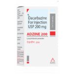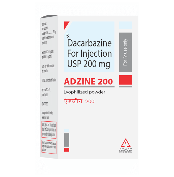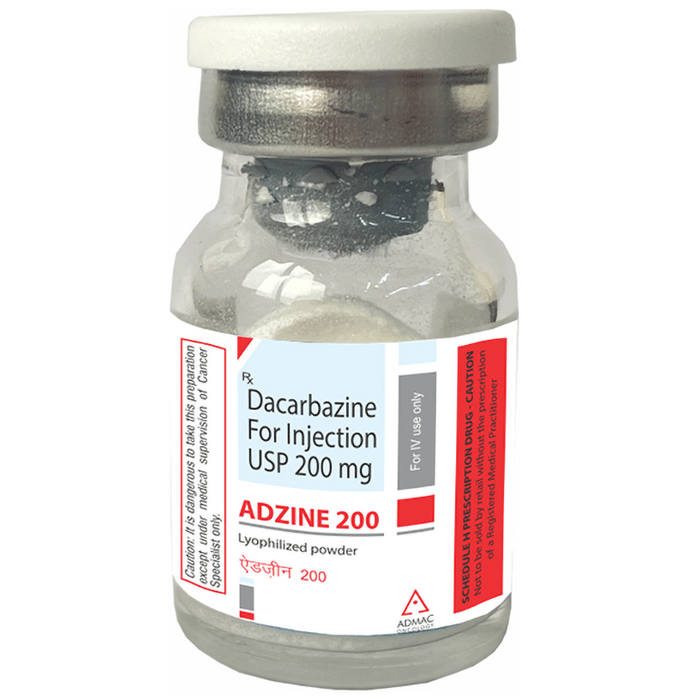 How is Adzine 200 Injection administered?::: Adzine 200 Injection is administered as infusion or injection. Absorption by mouth is slow and varies, therefore, intravenous (given through vein) infusion or injection administration is preferred.| Is Adzine 200 Injection a vesicant?::: Adzine 200 Injection is a potent vesicant (it is corrosive), and it should be carefully administered to avoid the risk of extravasation (leaking into the tissues).| What is Adzine 200 Injection used for?::: Adzine 200 Injection is used to treat skin cancer that has spread to other parts of the body (malignant melanoma), cancer of the white blood cell (Hodgkin’s lymphoma) and advanced adult soft tissue sarcomas (cancer of soft tissues such as muscles, tendons, fat, and blood vessels).| How effective is Adzine 200 Injection?::: Adzine 200 Injection is effective if taken at recommended dosage and duration as advised by your doctor.| Does Adzine 200 Injection cause hair loss?::: Yes, hair loss is a common side effect of Adzine 200 Injection.: