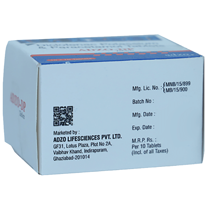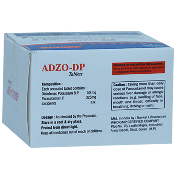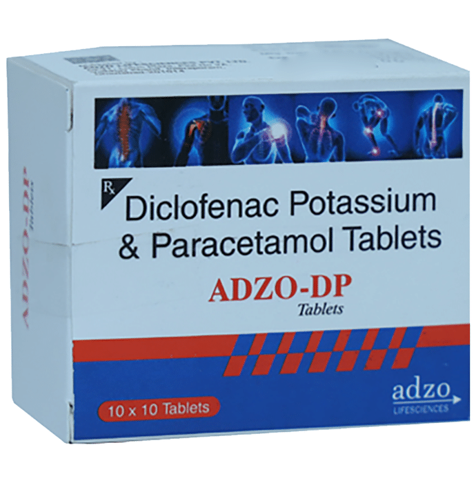 What is Adzo-DP Tablet?::: Adzo-DP Tablet is a combination of two medicines: Diclofenac and Paracetamol. This medication helps in relieving pain and inflammation. It works by lowering the levels of chemical substances in the body that cause pain and inflammation. Paracetamol / Acetaminophen has an early onset of action which means that it takes very less time to start its action and it helps in relieving the symptoms till diclofenac starts working.| Is it safe to use Adzo-DP Tablet?::: Yes, Adzo-DP Tablet is safe for most of the patients. However, in some patients it may cause some unwanted common side effects like nausea, vomiting, stomach pain, heartburn, diarrhea and other uncommon and rare side effects. Inform your doctor if you experience any persistent problem while taking this medication.| Can I stop taking Adzo-DP Tablet when my pain is relieved?::: Adzo-DP Tablet, when used for long-term pain relief, should be continued for as long as advised by your physician. It can be discontinued if you are using it for short-term pain relief.| Can the use of Adzo-DP Tablet cause nausea and vomiting?::: Yes, the use of Adzo-DP Tablet can cause nausea and vomiting. Taking it with milk, food or with antacids can prevent nausea. Avoid taking fatty or fried foods along with this medication. In case of vomiting, drink plenty of water or other fluids by taking small frequent sips. Talk to your doctor if vomiting persists and you notice signs of dehydration, like dark colored and strong-smelling urine and a low frequency of urination. Do not take any other medicine without speaking to your doctor.| Can the use of Adzo-DP Tablet cause dizziness?::: Yes, the use of Adzo-DP Tablet can cause dizziness (feeling faint, weak, unsteady or lightheaded) in some patients. If you feel dizzy or lightheaded it is better to rest for some time and resume once you feel better.| Can the use of Adzo-DP Tablet cause damage to kidneys?::: Yes, the long-term use of Adzo-DP Tablet can cause damage to the kidneys. Normal kidneys produce a chemical called prostaglandins that protect them from damage. Use of painkillers lowers the levels of prostaglandins in the body leading to kidney damage on long-term use. Use of painkillers is not recommended in patients with underlying kidney disease.| Are there any specific contraindications associated with the use of Adzo-DP Tablet?::: The use of Adzo-DP Tablet is considered to be harmful in patients with known allergy to painkillers (NSAIDs) or any of the components or excipients of this medicine. The use of this medicine should preferably be avoided in patients with a history of stomach ulcers or in patients with active, recurrent stomach ulcer/bleeding. It should also be avoided in patients with the history of heart failure, high blood pressure, and liver or kidney disease.| Can Adzo-DP Tablet be taken with Vitamin B-complex?::: Yes, Adzo-DP Tablet can be taken with Vitamin B-complex preparations. While Adzo-DP Tablet helps to relieve pain, Vitamin B-complex can help to correct the vitamin deficiency that might be causing the underlying painful condition.| Is it safe to take a higher than the recommended dose of Adzo-DP Tablet?::: No, taking a higher than the recommended dose of Adzo-DP Tablet can lead to increased chances of side effects like nausea, vomiting, heartburn, indigestion, diarrhea and can also damage your kidneys on long-term use. If you are experiencing increased severity of pain or the pain is not relieved by the recommended doses of this medicine, please consult your doctor for re-evaluation.| What is the recommended storage condition for Adzo-DP Tablet?::: Keep this medicine in the container or the pack it came in, tightly closed. Store it according to the instructions mentioned on the pack or label. Dispose of the unused medicine. Make sure it is not consumed by pets, children and other people.: