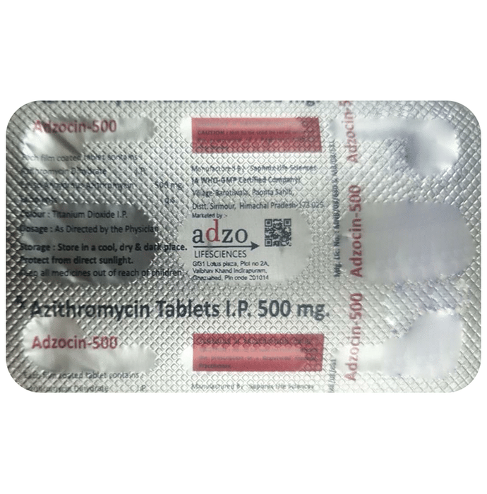 Is Adzocin 500 Tablet safe?::: Adzocin 500 Tablet is safe if used at prescribed doses for the prescribed duration as advised by your doctor.| What if I don’t get better?::: You should inform your doctor if you do not notice any improvement in your symptoms after 3 days of taking Adzocin 500 Tablet. Also, if your symptoms get worse, inform your doctor immediately.| Can the use of Adzocin 500 Tablet cause diarrhea?::: Yes, the use of Adzocin 500 Tablet can cause diarrhea. It is an antibiotic which kills the harmful bacteria. However, it also affects the helpful bacteria in your stomach or intestine and causes diarrhea. If you are experiencing severe diarrhea, talk to your doctor about it.| Can Adzocin 500 Tablet be taken at night?::: Adzocin 500 Tablet is usually prescribed once daily. You can take it at any time of the day, but remember to take it at the same time each day. The medicine should be taken 1 hour before meals or 2 hours after eating food. You can take the tablet preparation with or without food. However, you must take Adzocin 500 Tablet exactly as advised by your doctor and ask your doctor if you have any doubts.| How long does it take Adzocin 500 Tablet to work?::: Adzocin 500 Tablet starts working within a few hours of taking it. You may notice an improvement in symptoms after a few days. Do not stop taking the medicine without completing the course mentioned by your doctor. Stopping the medicine without consulting your doctor may cause the infection to come back which may be more difficult to treat.| Why is Adzocin 500 Tablet given for 3 days?::: The duration of treatment depends on the type of infection being treated and the age of the patient. Adzocin 500 Tablet is not necessarily given for 3 days. In most bacterial infections, a single dose of 500 mg is given for 3 days. Alternatively, it can be given as 500 mg once on day 1 and then 250 mg once from day 2 to day 5. In some cases of infection such as genital ulcer disease, it is given as a single 1 gram dose. Therefore, you must stick to the regime advised by your doctor.| What should I avoid while taking Adzocin 500 Tablet?::: Generally, it is recommended that patients taking Adzocin 500 Tablet should avoid taking any antacid with this medicine as this can affect the overall effectiveness of Adzocin 500 Tablet. It is also recommended to avoid exposure to sunlight or tanning beds as Adzocin 500 Tablet increases the risk of sunburn.| Is Adzocin 500 Tablet a strong antibiotic?::: Adzocin 500 Tablet is an effective antibiotic that is used for the treatment of many bacterial infections. Compared to other antibiotics, Adzocin 500 Tablet has a longer half-life which means that it stays in the body for a long time because of which it is given once a day and for a short span of time. Other antibiotics comparatively have a shorter half-life and are usually given twice, thrice, or four times a day.| Can you get a yeast infection from taking Adzocin 500 Tablet?::: Some people may get a fungal or yeast infection known as thrush after taking Adzocin 500 Tablet. Antibiotics such as Adzocin 500 Tablet can kill the normal or ‘good bacteria’ of your intestine responsible for preventing thrush. You should inform your doctor if you get a sore or vaginal itching or discharge. Also, inform your doctor if you get a white patch in the mouth or tongue after taking Adzocin 500 Tablet or soon after stopping it.: