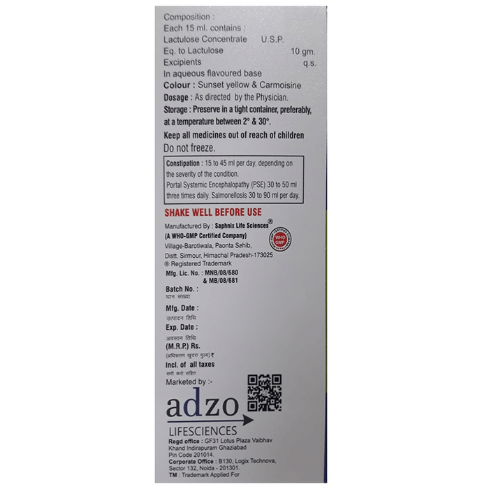 How long does it take for Adzolex-Plus Oral Solution Sugar Free to work?::: It takes about 2-3 days to see the benefits of the treatment. Talk to your doctor if you feel constipated even after 3 days of taking Adzolex-Plus Oral Solution Sugar Free.| What is Adzolex-Plus Oral Solution Sugar Free used for?::: Adzolex-Plus Oral Solution Sugar Free is used to treat constipation which is presented as infrequent bowel movements, hard and dry stools. It is also used in patients with hepatic encephalopathy which is a serious liver problem causing confusion, tremors and decreased level of consciousness.| Is Adzolex-Plus Oral Solution Sugar Free a laxative?::: Yes, Adzolex-Plus Oral Solution Sugar Free is a laxative which softens the stools by pulling in water from the body to the large intestine. It is also used to reduce the amount of ammonia in the blood of patients with liver disease.| What are the side effects of taking Adzolex-Plus Oral Solution Sugar Free?::: Adzolex-Plus Oral Solution Sugar Free very commonly causes diarrhea, flatulence, nausea, vomiting and abdominal pain. Diarrhea and abdominal pain occur due to a high dose. In such cases, the dose should be reduced. Flatulence may occur during the first few days of treatment and may disappear after sometime. This medicine may also cause electrolyte imbalance. However, this is an uncommon side effect.| Is it okay to take Adzolex-Plus Oral Solution Sugar Free every day?::: You should take Adzolex-Plus Oral Solution Sugar Free for as long as advised by your doctor. You may also take it for as long as constipation lasts, which may be up to a week. For hepatic encephalopathy, the treatment may be longer, even several months.| Who should not be given Adzolex-Plus Oral Solution Sugar Free?::: Adzolex-Plus Oral Solution Sugar Free should not be given to patients who are allergic to it or are intolerant to lactose (cannot process lactose). It should also be avoided in patients having galactosemia, a rare health problem where the body cannot process galactose.| Can I take other laxatives along with Adzolex-Plus Oral Solution Sugar Free?::: Usually, one laxative is sufficient to relieve constipation. In case you need more, your doctor may advise you to take one more laxative along with Adzolex-Plus Oral Solution Sugar Free. The risk of side effects is more with two laxatives.| What if I take more than the recommended dose of Adzolex-Plus Oral Solution Sugar Free?::: Taking more than the recommended dose of Adzolex-Plus Oral Solution Sugar Free may cause abdominal pain, electrolyte imbalance and diarrhea, which may last for a couple of days.| How should Adzolex-Plus Oral Solution Sugar Free be taken?::: You should take the prescribed amount in the measuring cup or spoon that is provided with the medicine. You can take it with water or fruit juice if you find it very sweet. Drink plenty of water for better results. Swallow it as soon as you keep it in mouth to prevent tooth decay which can occur if you take it for a longer time.: