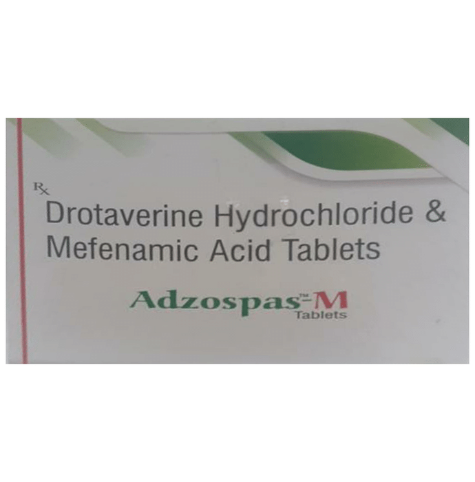 What is Adzospas-M Tablet?::: Adzospas-M Tablet is a combination of two medicines: Drotaverine and Mefenamic acid. This medication helps to relieve abdominal pain. Drotaverine relieves muscle spasms associated with smooth muscles in the abdomen. Mefenamic Acid works by blocking the release of certain chemical messengers that cause pain and inflammation (swelling).| Is it safe to use Adzospas-M Tablet?::: Yes, Adzospas-M Tablet is safe for most of the patients with abdominal pain. However, in some patients it may cause common side effects like nausea, vomiting, heartburn, diarrhoea, loss of appetite, dryness in the mouth, weakness, sleepiness and other uncommon or rare side effects. If you experience any persistent problem while taking this medication, inform your doctor as soon as possible.| Can I stop taking Adzospas-M Tablet when my pain is relieved?::: Adzospas-M Tablet is usually used for short term and can be discontinued when your pain is relieved. However, Adzospas-M Tablet should be continued if your physician has advised you to do so.| Can the use of Adzospas-M Tablet cause nausea and vomiting?::: Yes, the use of Adzospas-M Tablet can cause nausea and vomiting. Taking it with milk, food or with antacids can prevent nausea. In case of vomiting, drink plenty of water or other fluids by taking small and frequent sips. Also, avoid taking fatty or fried foods along with the medicine. Talk to your doctor if you have vomiting persists and you notice any signs of dehydration like less urination with dark coloured and strong-smelling urine. Do not take any other medicine without consulting your doctor.| Can the use of Adzospas-M Tablet cause dry mouth?::: Yes, the use of Adzospas-M Tablet can cause dry mouth. If you experience dry mouth, drink plenty of water. Take regular sips during the day and keep some water by your bed at night. You may use lip balm if your lips are also dry. Avoid spicy, salty and acidic foods (like lemons).| Can I take a higher than the recommended dose of this medicine?::: No, do not take a higher than the recommended dose of Adzospas-M Tablet as it can increase the risks of side effects. If you are experiencing increased severity of pain or the pain is not relieved by the recommended doses, please consult your doctor for re-evaluation.| What are the recommended storage conditions for Adzospas-M Tablet?::: Keep this medicine in the container or the pack it came in, tightly closed. Store it according to the instructions mentioned on the pack or label. Dispose of the unused medicine. Make sure it is not consumed by pets, children and other people.: