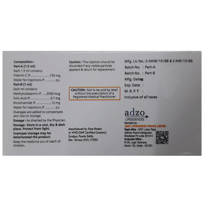 Adzovit 12 Combipack Injection is a combination medicine that is used in the treatment of nutritional deficiencies. It helps in the growth and development of body and replenishes the body’s stores of important nutrients. Adzovit 12 Combipack Injection is given as an injection under the supervision of a doctor and should not be self-administered. The dose and how often you take it depends on what you are taking it for. Your doctor will decide how much you need to improve your symptoms. You should keep taking the medicine as long as it prescribed to you.It is safe to use medicine with no common side effects. Usually, it is suggested to avoid alcohol while taking this medicine. Your doctor should also know about all other medicines you are taking as many of these may make this medicine less effective or change the way it works.