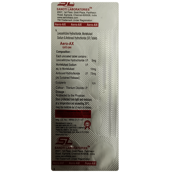 Aero-AX Tablet SR is a combination medicine used in the treatment of respiratory tract disorders associated with viscid mucus. It provides symptomatic relief of productive cough associated with respiratory tract disorders like bronchial asthma, bronchitis, and the common cold. Aero-AX Tablet SR may be taken with or without food in a dose and duration as advised by the doctor. The dose you are given will depend on your condition and how you respond to the medicine. You should keep taking this medicine for as long as your doctor recommends. If you stop treatment too early your symptoms may come back and your condition may worsen. Let your healthcare team know about all other medications you are taking as some may affect, or be affected by this medicine.The most common side effects are nausea, stomach upset, dryness in mouth, flu-like symptoms, fatigue, dizziness, and headache. Most of these are temporary and usually resolve with time. Contact your doctor straight away if you are at all concerned about any of these side effects. This medicine may also cause dizziness and sleepiness, so do not drive or do anything that requires mental focus until you know how this medicine affects you. Avoid drinking alcohol while taking this medicine as it can worsen your sleepiness.Before taking it, you should tell your doctor if you have any kidney or liver diseases so that your doctor can prescribe a suitable dose for you. You should also tell your doctor if you are pregnant, planning pregnancy or breastfeeding.