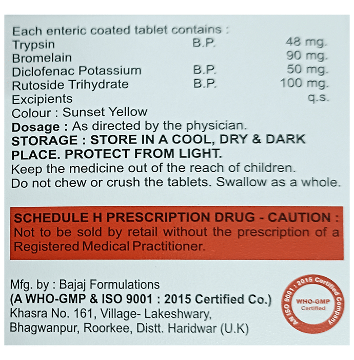 Trypsin (48mg) + Bromelain (90mg) + Rutoside (100mg) + Diclofenac (50mg):<packagingdetail>:Strip: