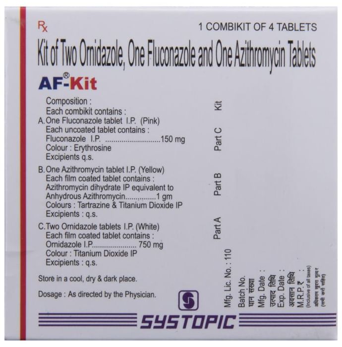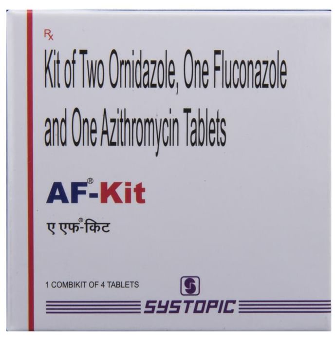 Can I stop taking AF Kit Tablet when I feel better?::: No, do not stop taking AF Kit Tablet and complete the full course of treatment even if you feel better. Your symptoms may improve before the infection is completely cured.| Can the use of AF Kit Tablet cause diarrhea?::: Yes, the use of AF Kit Tablet can cause diarrhea. In case of diarrhea, drink plenty of water or other fluids. Talk to your doctor if diarrhea persists and you notice any signs of dehydration, like less urination with dark colored and strong-smelling urine. Do not take any other medicine without consulting a doctor.| Will a higher than the recommended dose of AF Kit Tablet be more effective?::: No, taking a higher than the recommended dose may not be more effective, rather it may increase the chances of having serious side effects and toxicity. If the recommended doses do not relieve your symptoms or there is an increased severity of your symptoms, please consult your doctor.| What are the instructions for storage and disposal of AF Kit Tablet?::: Keep this medicine in the container it came in, tightly closed. Store it according to the instructions mentioned on the pack or label. Dispose of the unused medicine. Make sure it is not consumed by pets, children and other people.| What if I don’t get better after using AF Kit Tablet?::: Inform your doctor if you don’t feel better after finishing the full course of treatment. Also, inform him if your symptoms are getting worse while using this medicine.| Can I stop taking AF Kit Tablet when I feel better?::: No, do not stop taking AF Kit Tablet and complete the full course of treatment even if you feel better. Your symptoms may improve before the infection is completely cured.: