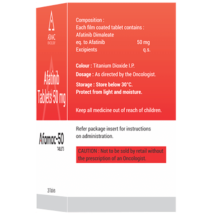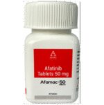 Is Afamac 50 Tablet an immunotherapy or chemotherapy?::: Afamac 50 Tablet is neither an immunotherapy nor a conventional chemotherapy. It belongs to kinase inhibitors class of anti-cancer medicines. It works by blocking a group of proteins. These proteins are known to be involved in the growth and spread of cancer cells. By blocking the activity of these proteins, Afamac 50 Tablet stops the cancer cells from growing and multiplying.| How long does it take for Afamac 50 Tablet to work?::: The peak levels of Afamac 50 Tablet are reached 2-5 hours after taking it. However, it may take weeks or months to see a noticeable change in the progression of cancer. The symptoms may improve visibly, but the effectiveness of Afamac 50 Tablet can be confirmed only after determining certain parameters.| How should I take Afamac 50 Tablet?::: Afamac 50 Tablet is taken by mouth without food, at least 1 hour before or 3 hours after meals. Swallow the complete tablet with water without crushing or breaking it. Take this medicine once daily at about the same time each day. This will make it easier to remember to take this medicine. If you have difficulty in swallowing the tablet, dissolve it in a glass of water. Do not use any other liquid instead of water. Drop the tablet into the water without crushing it and stir occasionally for up to 15 minutes until the tablet is broken up into very small particles. Drink the liquid straight away. Then refill the glass with water and drink it to make sure all medicine is taken.| Does Afamac 50 Tablet have any effect on fertility?::: Afamac 50 Tablet may decrease fertility in both men and women Therefore, if you have any concerns regarding fertility, talk to your doctor who might suggest sperm or egg preservation before starting treatment.| Can Afamac 50 Tablet be given along with chemotherapy?::: There are no supporting studies to suggest that Afamac 50 Tablet can be used along with other chemotherapy medicines. Afamac 50 Tablet is used to treat specific type of lung cancer when the prior chemotherapy has been insufficient.| Can Afamac 50 Tablet cure lung cancer?::: No, Afamac 50 Tablet cannot cure lung cancer, but it prolongs the survival of the patient. It may also reduce the size of the tumor.| What should I avoid while taking Afamac 50 Tablet?::: You should avoid sun exposure as Afamac 50 Tablet can make your skin sensitive to the sun. You may get a severe sunburn or may develop rash or acne or it may get worsened. Therefore, use sunscreen and wear a hat before moving out in the sun. Wear clothes that cover your skin if you have to go out in the sun.| Can I do something if I get diarrhea due to Afamac 50 Tablet?::: Diarrhea is a very common side effect of Afamac 50 Tablet. Severe diarrhea can cause excessive loss of body fluids (dehydration) and kidney problems that can sometimes lead to death. Start drinking plenty of fluids at the first signs of diarrhea and contact your doctor immediately. The doctor will start the appropriate antidiarrheal treatment (e.g. loperamide) as soon as possible. The doctor may also reduce your dose or discontinue the therapy if you develop severe diarrhea.: