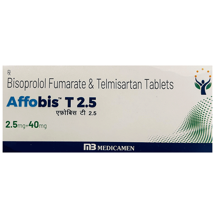 Affobis T 2.5 Tablet is a combination medicine used in the treatment of hypertension (high blood pressure). It works by relaxing the blood vessels and making the heart more efficient at pumping blood throughout the body. It is advised to take Affobis T 2.5 Tablet at a fixed time each day to maintain consistent levels of medicine in the blood. Keep taking it for as long as advised by your doctor. Even if you feel well, do not stop this medicine on your own because high blood pressure often has no symptoms. If you stop taking it, your condition may get worse. Keeping active with regular exercise, reducing your weight and eating a healthy diet will also help control your blood pressure. Follow your doctor’s advice while taking this medicine.Some common side effects of this medicine include headache, cold extremities, slow heart rate, numbness of extremities, decreased blood pressure, weakness, and increased potassium level in blood. It is advised to avoid potassium rich food and supplements while taking this medicine. It may cause dizziness, avoid driving or rise slowly from the sitting position. You may be asked for regular monitoring of blood pressure and electrolytes level in the blood during the treatment.Before taking it, let your doctor know if you have any liver or kidney problems. Pregnant or breastfeeding women should also consult their doctor for advice before taking this medicine. You also need to tell your doctor what other medicines you are taking especially those used to treat high blood pressure or heart conditions.