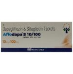 Affodapa S 10/100 Tablet is a combination medicine that helps control blood sugar levels. This medicine is used together with diet and exercise to improve blood sugar control in adults with type 2 diabetes mellitus. It helps in proper utilization of insulin, thereby lowering the blood sugar level. Affodapa S 10/100 Tablet can be taken with or without food at any time of day but try to take it at the same time every day. The dose will be decided by your doctor, and don’t stop taking it without consulting them. If you do, your blood sugar levels may increase and put you at risk of serious complications like kidney damage and blindness. This medicine is only a part of the treatment program that should include a healthy diet, regular exercise, and weight reduction as advised by your doctor.The most common side effects of Affodapa S 10/100 Tablet include urinary tract infection, nasal congestion, sore throat, and upper respiratory tract infection. Drinking plenty of fluids while using it will help prevent dehydration. Some people may develop fungal infections in the genital area. Maintaining good hygiene can help prevent this.Before taking this medicine, inform your doctor if you have any kidney or liver problems, a urinary tract infection, or you are on water pills (diuretics). Pregnant or breastfeeding women should also consult their doctor before taking it. Avoid excessive alcohol intake while taking this drug as this may increase the risk of some side effects. Monitor your blood sugar levels regularly while taking this medicine.