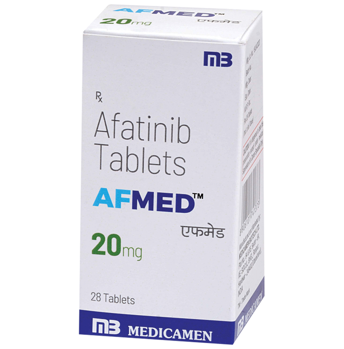 Is Afmed 20mg Tablet an immunotherapy or chemotherapy?::: Afmed 20mg Tablet is neither an immunotherapy nor a conventional chemotherapy. It belongs to kinase inhibitors class of anti-cancer medicines. It works by blocking a group of proteins. These proteins are known to be involved in the growth and spread of cancer cells. By blocking the activity of these proteins, Afmed 20mg Tablet stops the cancer cells from growing and multiplying.| How long does it take for Afmed 20mg Tablet to work?::: The peak levels of Afmed 20mg Tablet are reached 2-5 hours after taking it. However, it may take weeks or months to see a noticeable change in the progression of cancer. The symptoms may improve visibly, but the effectiveness of Afmed 20mg Tablet can be confirmed only after determining certain parameters.| How should I take Afmed 20mg Tablet?::: Afmed 20mg Tablet is taken by mouth without food, at least 1 hour before or 3 hours after meals. Swallow the complete tablet with water without crushing or breaking it. Take this medicine once daily at about the same time each day. This will make it easier to remember to take this medicine. If you have difficulty in swallowing the tablet, dissolve it in a glass of water. Do not use any other liquid instead of water. Drop the tablet into the water without crushing it and stir occasionally for up to 15 minutes until the tablet is broken up into very small particles. Drink the liquid straight away. Then refill the glass with water and drink it to make sure all medicine is taken.| Does Afmed 20mg Tablet have any effect on fertility?::: Afmed 20mg Tablet may decrease fertility in both men and women Therefore, if you have any concerns regarding fertility, talk to your doctor who might suggest sperm or egg preservation before starting treatment.| Can Afmed 20mg Tablet be given along with chemotherapy?::: There are no supporting studies to suggest that Afmed 20mg Tablet can be used along with other chemotherapy medicines. Afmed 20mg Tablet is used to treat specific type of lung cancer when the prior chemotherapy has been insufficient.| Can Afmed 20mg Tablet cure lung cancer?::: No, Afmed 20mg Tablet cannot cure lung cancer, but it prolongs the survival of the patient. It may also reduce the size of the tumor.| What should I avoid while taking Afmed 20mg Tablet?::: You should avoid sun exposure as Afmed 20mg Tablet can make your skin sensitive to the sun. You may get a severe sunburn or may develop rash or acne or it may get worsened. Therefore, use sunscreen and wear a hat before moving out in the sun. Wear clothes that cover your skin if you have to go out in the sun.| Can I do something if I get diarrhea due to Afmed 20mg Tablet?::: Diarrhea is a very common side effect of Afmed 20mg Tablet. Severe diarrhea can cause excessive loss of body fluids (dehydration) and kidney problems that can sometimes lead to death. Start drinking plenty of fluids at the first signs of diarrhea and contact your doctor immediately. The doctor will start the appropriate antidiarrheal treatment (e.g. loperamide) as soon as possible. The doctor may also reduce your dose or discontinue the therapy if you develop severe diarrhea.: