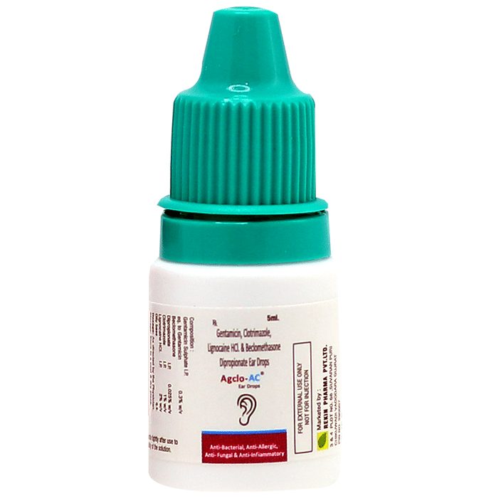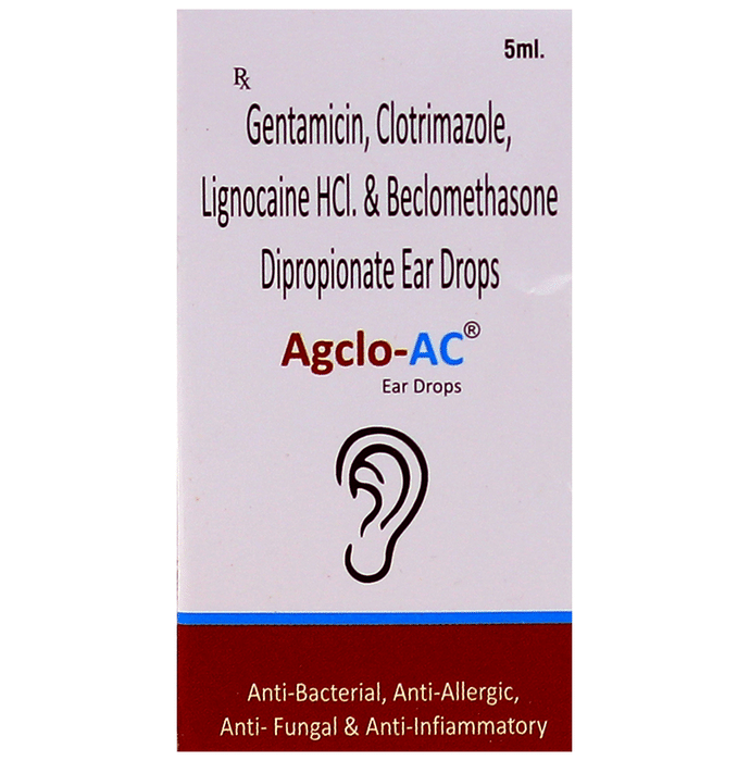 Agclo-AC Ear Drop is a medicine used to treat ear infections. It works by killing and inhibiting the growth of microorganisms in the ear. This relieves discomfort, itching, irritation, and pain in the ear. Agclo-AC Ear Drop is for external use only. Use it in the dose and duration as advised by your doctor. This medicine should be used regularly to get the most benefit from it. You can help the medicine work better by keeping the affected areas clean, making sure they are dry, and washing your hands before and after treating the infection.It is generally well-tolerated with little or no side effects. However, it may cause a burning sensation, irritation, itching, and redness immediately following application. These side effects are temporary and usually subside on their own. Inform your doctor if they persist for a longer duration.Although medicines used on the ear are not normally affected by other medicines, you should let your doctor know if you are taking any other medicine to be safe. If you are pregnant or breastfeeding, ask the advice of your doctor before using the medicine.