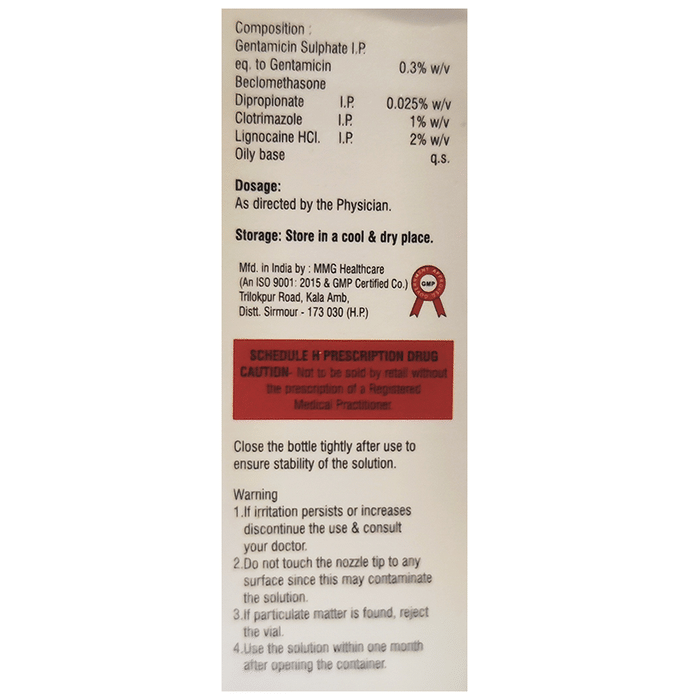 Lidocaine (2% w/v) + Beclometasone (0.025% w/v) + Clotrimazole (1% w/v) + Gentamicin (0.3% w/v):<packagingdetail>:Bottle: