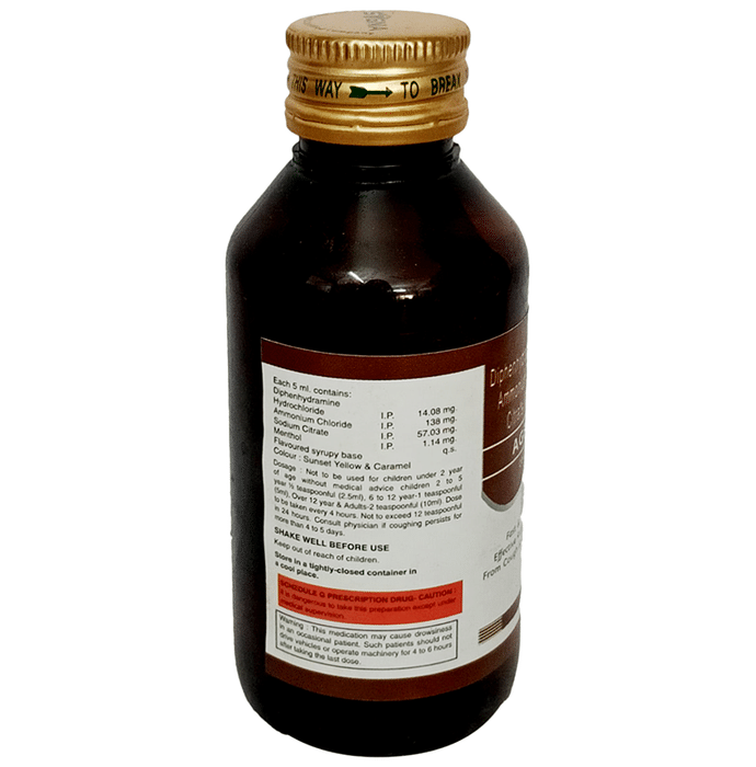 Agedryl Syrup is a combination medicine used to treat cough. It thins the mucus in the nose and windpipe, making it easier to cough out. This medicine also relieves allergic symptoms like runny nose, watery eyes, sneezing, throat irritation. Agedryl Syrup is taken with or without food in a dose and duration as advised by the doctor. The dose you are given will depend on your condition and how you respond to the medicine. You should keep taking this medicine for as long as your doctor recommends. If you stop treatment too early your symptoms may come back and your condition may worsen. Let your doctor know about all other medications you are taking as some may affect, or be affected by this medicine.The most common side effects are stomach pain, allergic reaction, thickened respiratory tract secretions, and coordination impaired. Most of these are temporary and usually resolve with time. Contact your doctor straight away if you are at all concerned about any of these side effects. This medicine can also cause sleepiness, so do not drive or do anything that requires mental focus until you know how this medicine affects you. Avoid drinking alcohol while taking this medicine as it can make sleepiness worse.Never support self-medication or recommend your medicine to another person. It is beneficial to have plenty of fluids while taking this medication. Before taking this medicine, you should tell your doctor if you are pregnant, planning pregnancy or breastfeeding. You should tell your doctor if you have any kidney or liver diseases so that your doctor can prescribe a suitable dose for you.