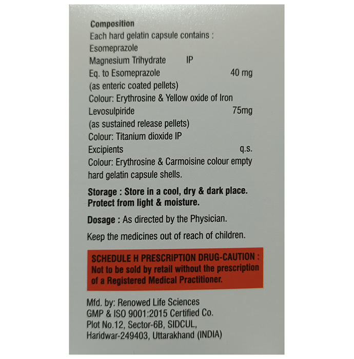 Levosulpiride (75mg) + Esomeprazole (40mg):<packagingdetail>:Strip: